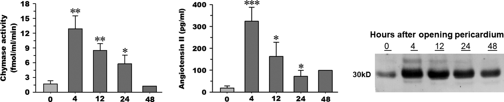 Early postoperative PCF chymase activation underscores its potential role in cardiac damage soon after on- or off-pump cardiac surgery. In addition, chymase in extracellular vesicles provides a protected delivery mechanism from neutralization by circulating serine protease inhibitors.