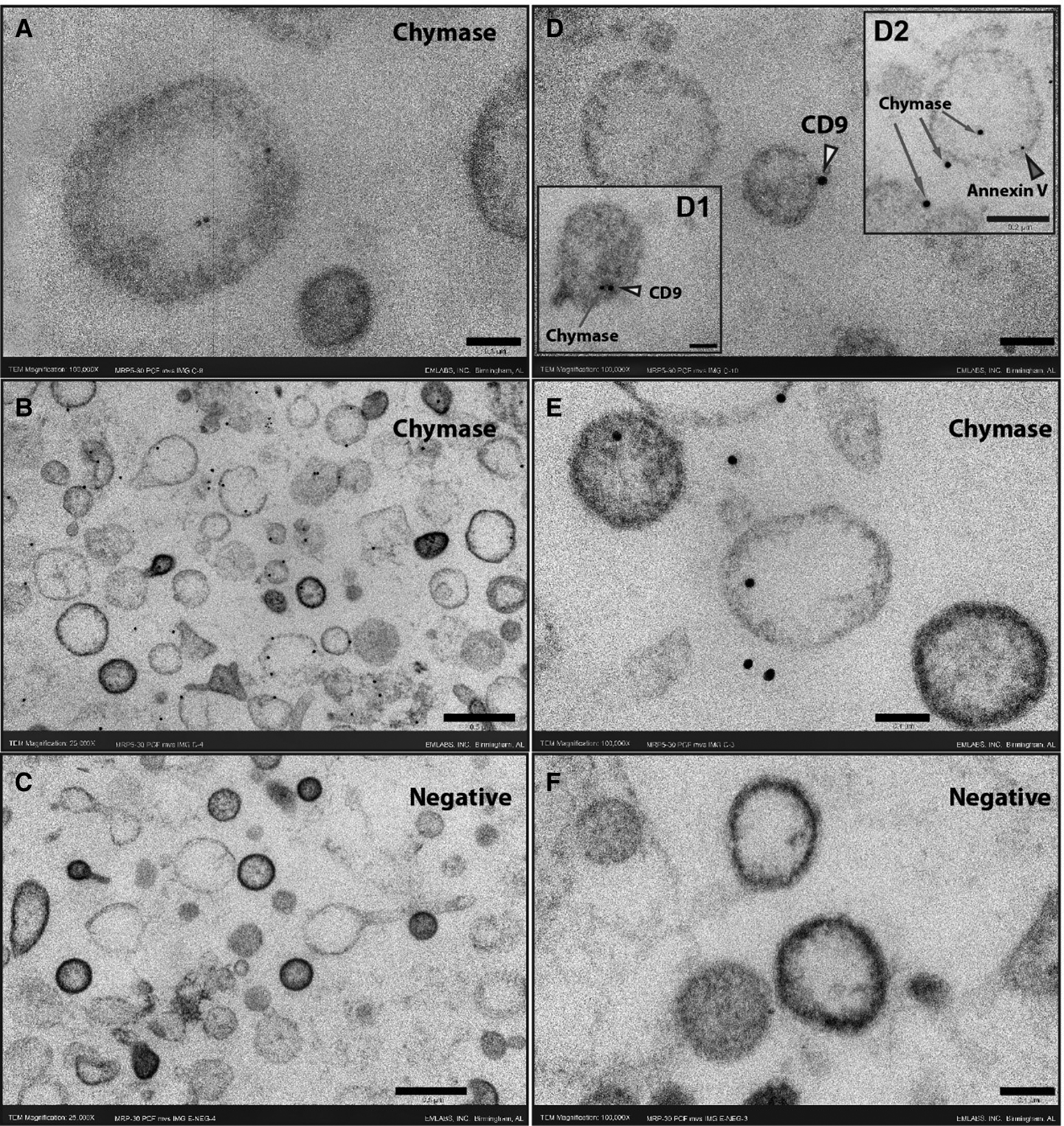 EV pellets (after spin 2 and 3) from PCF at the time of opening the pericardium were suspended in 0.1 M sodium cacodylate buffer pH 7.41 (NaCaC) for 1–2 h at 4°C to fix pellets and processed for transmission electron microscopy (TEM) as previously described in our lab (32). For immunogold labeling, EV pellets were submerged in 0.5% glutaraldehyde 3% paraformaldehyde in buffer (5% dextrose, 30 mM potassium chloride in PBS), further fixed in the same fixative in cacodylate buffer, incubated in 0.1M glycine/PBS, dehydrated in a series of N, N-dimethyl formamide, and embedded in LR White resin. Ultrathin (90 nm) sections were picked up onto nickel grids (3 mm), dried, and etched in a 3% solution of sodium m-periodate in 0.1N HCl (2 × 30 min each). Prior to immunolabeling, grids were rinsed in PBS (3 x) and blocked for 1.5 h with 1% BSA/1% goat serum/0.1% cold water fish skin gelatin/0.1% tween-20 in PBS. Grids were incubated with primary antibodies (diluted 1:25 in 1% BSA/PBS) to mouse monoclonal human CD9 (EMD Millipore #CBL162), rabbit polyclonal Annexin V (GeneTex #GTX103250), mouse monoclonal [CC1] to human mast cell chymase (Abcam #ab2377) or rabbit monoclonal [EPR13136] to recombinant mast cell chymase (Abcam #ab186417), for 2 h at room temperature and again overnight at 4°C. Grids were rinsed with PBS (4 x), blocked in 1% BSA/1% goat serum/PBS for 1.5 h, and incubated for 2 h at room temperature with goat anti-rabbit or anti-mouse immunoglobulin G tagged with colloidal gold (10-nm or 15-nm particle size respectively, diluted 1:50 with 1% BSA/PBS) (Aurion/Electron Microscopy Sciences, Hatfield, PA). Following post-fixation and counterstain with uranyl acetate, sections were imaged on a FEI-Tecnai T12 Spirit 20 electron microscope at 120 kv as previously described in our laboratory (32).