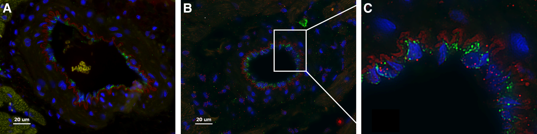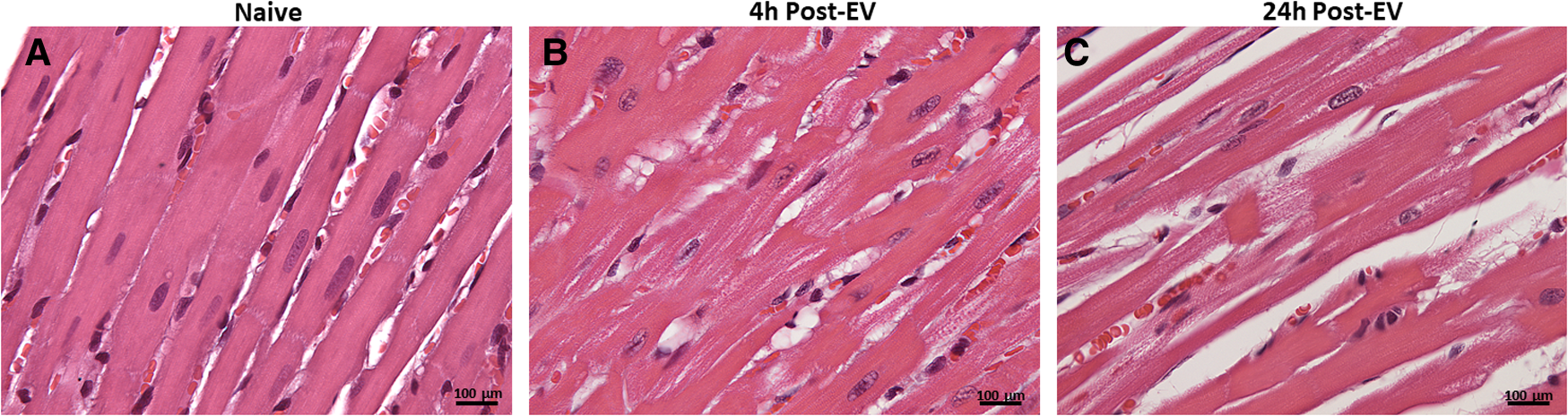 EVs isolated from the PCF drain at 24 h after surgery were intravenously injected in a single bolus (109–10 particles) into the jugular vein of adult male Sprague-Dawley rats as previously described in our laboratory (31, 32). Rats were euthanized at 4 and 24 h after injection, and heart tissue was excised, snap-frozen in liquid nitrogen, or fixed in formalin. Immunohistochemistry was performed on 5 µm formalin fixed paraffin embedded tissue sections using mouse anti-human mast cell chymase CC1 (1:50, Abcam ab2377), and rabbit anti-von Willebrand Factor (1:150, Chemicon 7356). Alexa Fluor 488- and 594-conjugated secondary antibodies (1:700; Life Technologies/Invitrogen Eugene, OR) were used and nuclei (blue) were counterstained with 4,6-diamidino-2-phenylindole (DAPI, 1.5 μg/ml; Vector Laboratories, Burlingame, CA). Images were acquired on a Leica DM6000 epifluorescence microscope with Simple-PCI software (Compix, Cranberry Township, PA) and adjusted appropriately to minimize background fluorescence.
