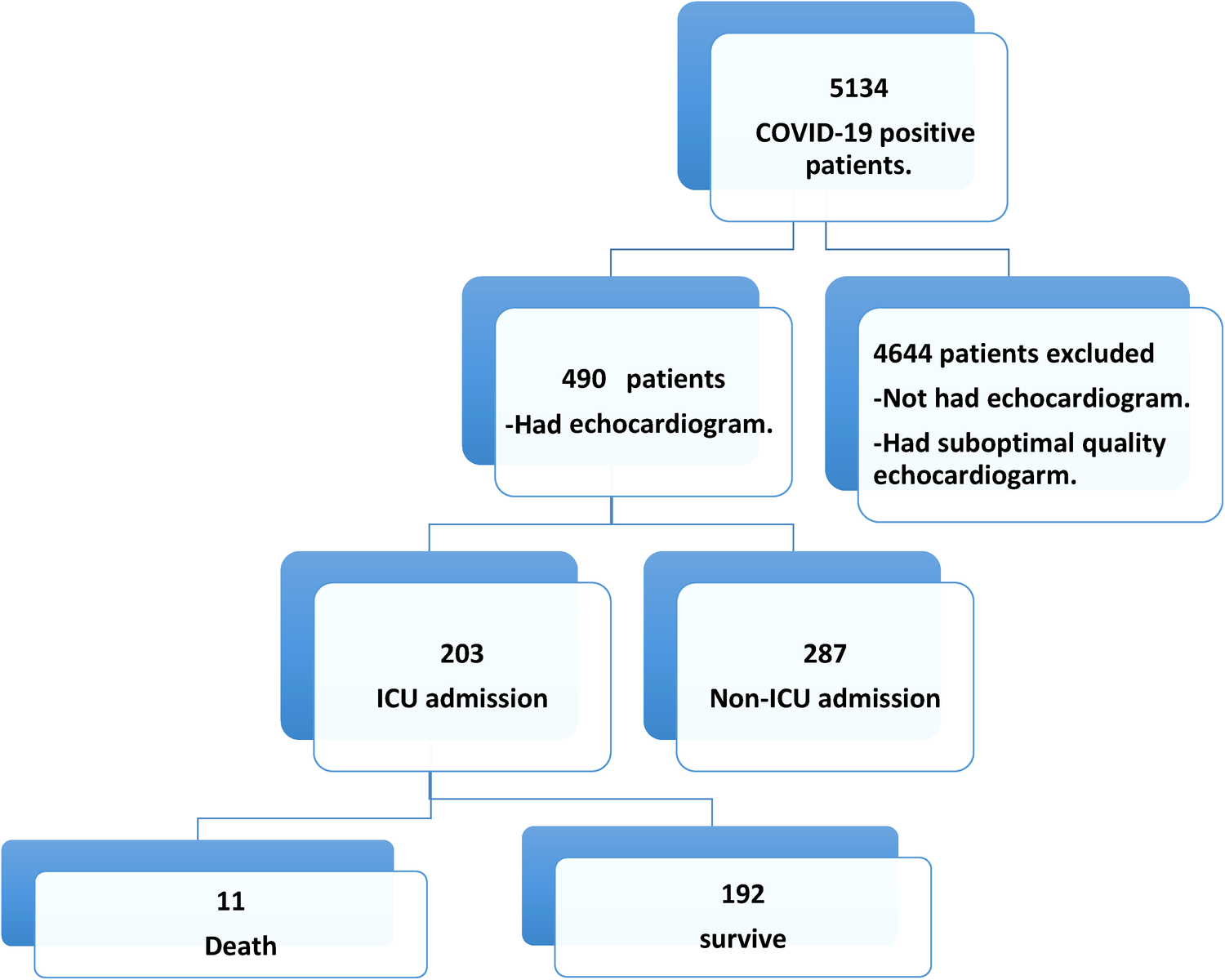 This observational study was conducted between June 2021 and July 2022. The analysis included all patients diagnosed with COVID-19 who had transthoracic echocardiographic (TTE) scans within 72 h of admission.