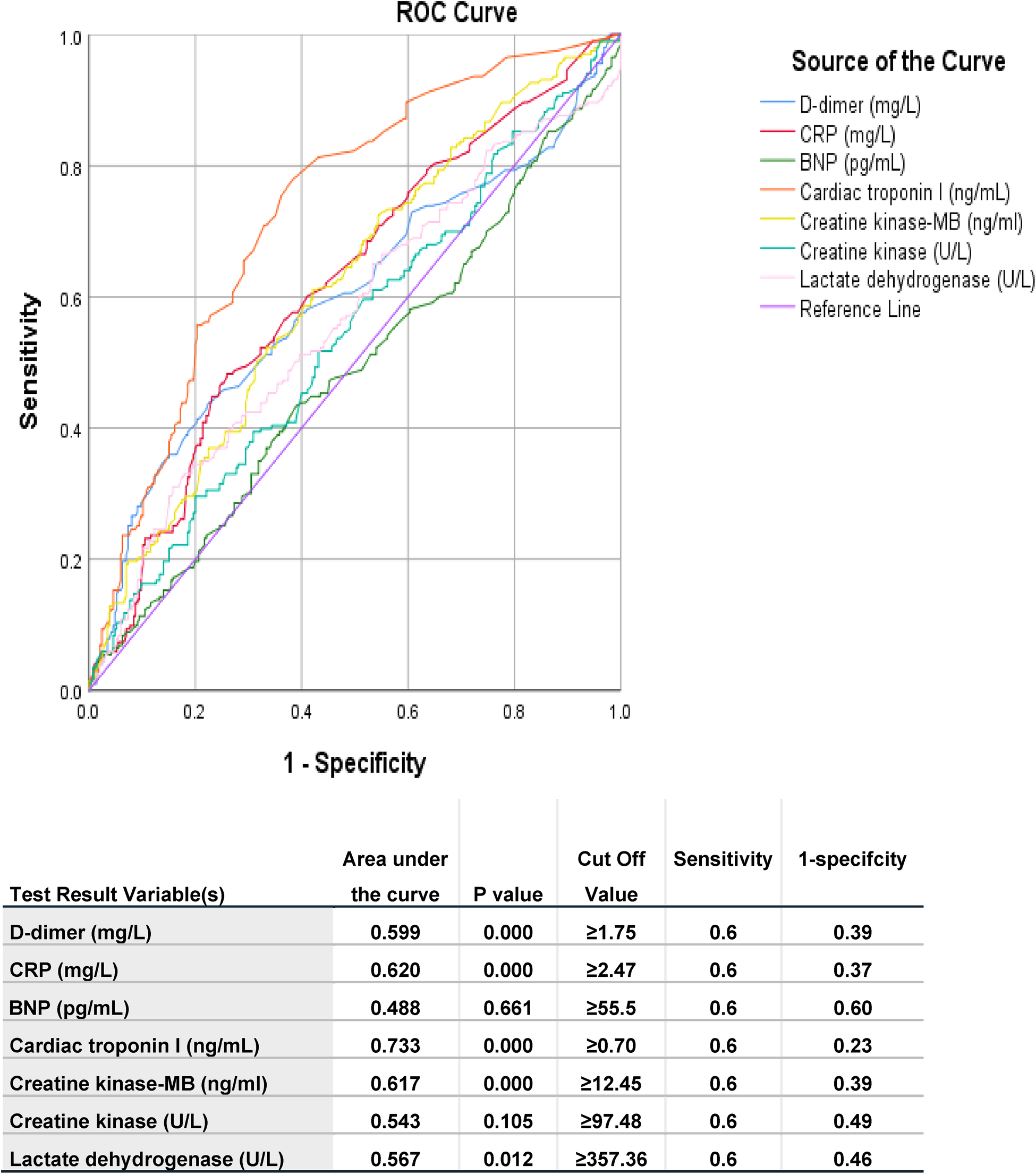 The data were statistically analyzed using Microsoft Excel 2016 (Seattle, WA, USA) and SPSS Statistics for Windows (version 26.0; IBM Corp., Armonk, NY, USA). The normality of each variable's data was checked using Kolmogorov–Smirnov and Shapiro–Wilk tests. Continuous, normally distributed variables are expressed as Means ± Standard Deviations, and 95% confidence intervals (CIs) and were compared between groups using the Student's t-test. Non-normally distributed variables are expressed as median (25th and 75th percentiles) and were compared using the Mann-Whitney U test. Whereas, the categorical variables are expressed as frequency (percent) and were compared using the Chi-squared test. The significance level was set at a p-value of 0.05. Predictors of poor outcomes (defined as number of patients who have one or more complications including PE, HF, ARDS, septic shock, RF, myocarditis, AKI and death) were assessed using binary logistic regression analysis. Receiver operator characteristic (ROC) curves were used to assess the inflammatory biomarkers and cardiac enzymes for predicting of Intensive Care Unit (ICU) admission.