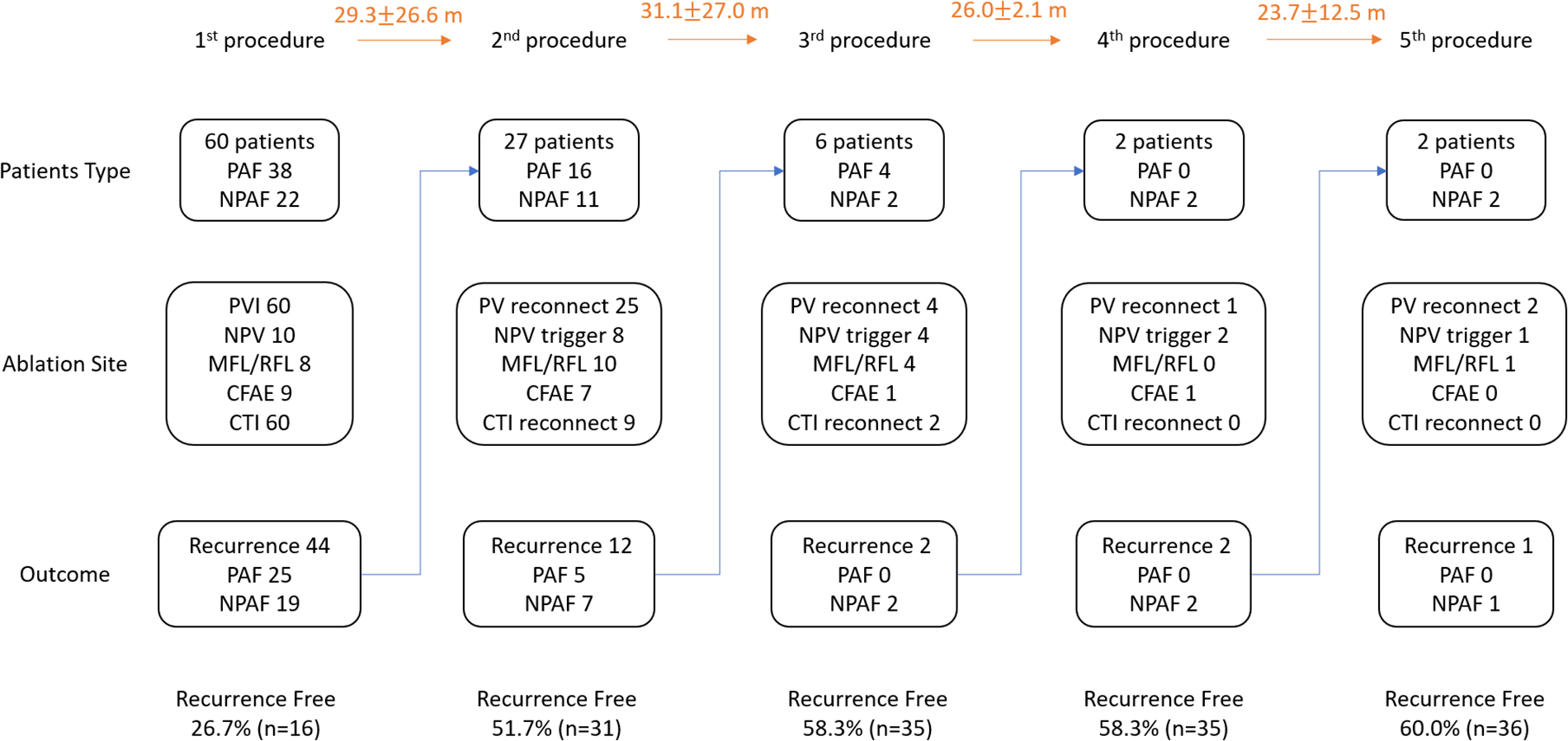 Ablation strategy and outcomes. The figure demonstrated the ablation strategies and long-term outcomes. CFAE, complex fractionated atrial electrogram; CTI, cavotricuspid isthmus; MFL, mitral flutter; NPAF, non-paroxysmal atrial fibrillation; NPV, non-pulmonary vein; PAF, paroxysmal atrial fibrillation; PV, pulmonary vein; PVI, pulmonary vein isolation; RFL, roof flutter.