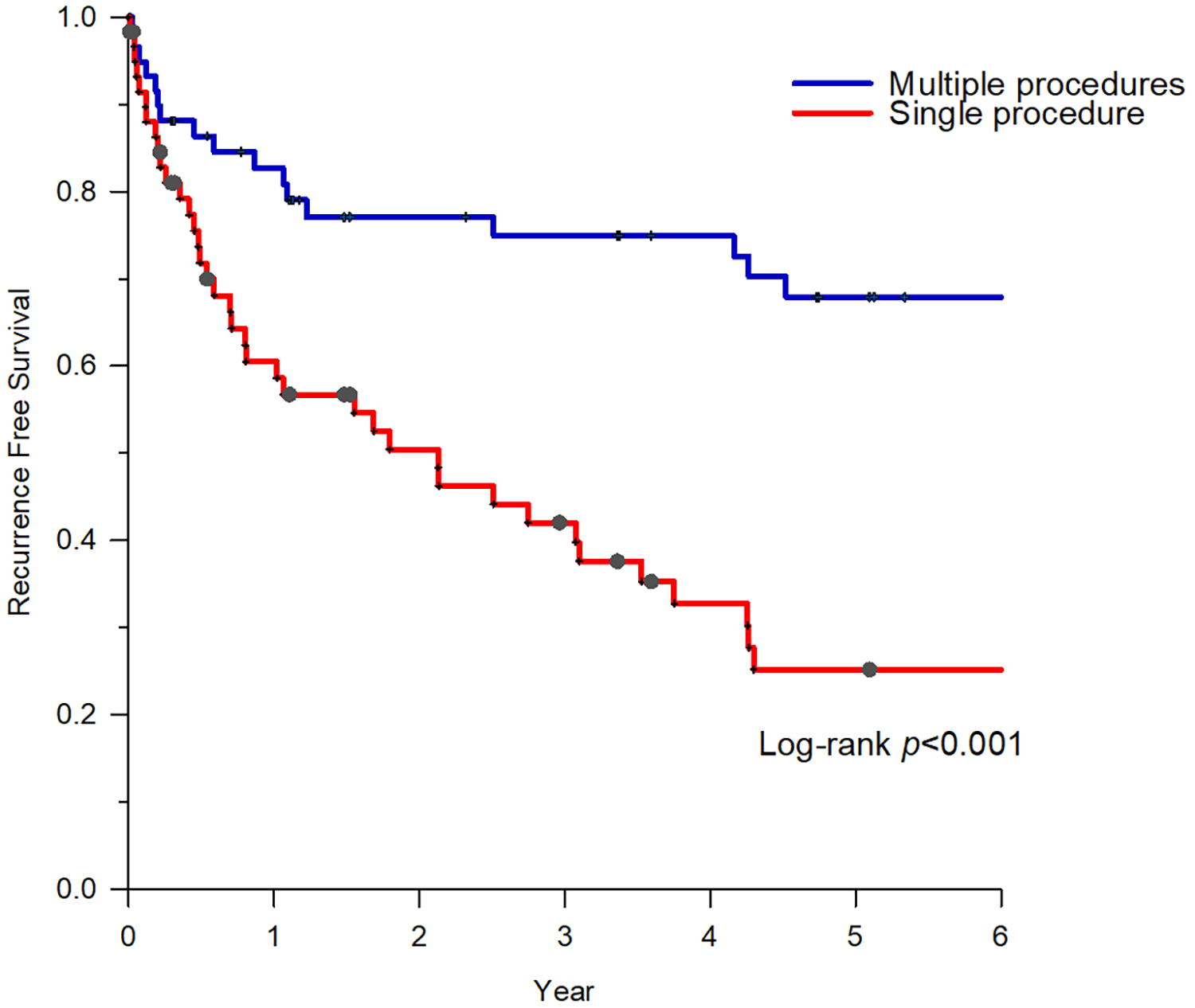 The index procedure was recurrence-free in 16 (26.7%) patients. The freedom from recurrence reached 60% (36/60) after the final procedure. Following the index procedure, AF recurrence was observed in 44 patients (73.3%), 17 of whom (38.6%) underwent drug escalation therapy instead of CA. Patients who underwent repeated CA demonstrated significantly improved atrial arrhythmia-free status (74.1%, 20/27) than those who underwent drug escalating therapy (29.4%, 5/17, P < 0.01). After a mean follow-up of 7.1 ± 4.2 years, with an average of 1.6 ± 0.9 times ablation, 41 of 60 patients (68.3%) in group 1 were completely free from atrial arrhythmias (Figure 2).