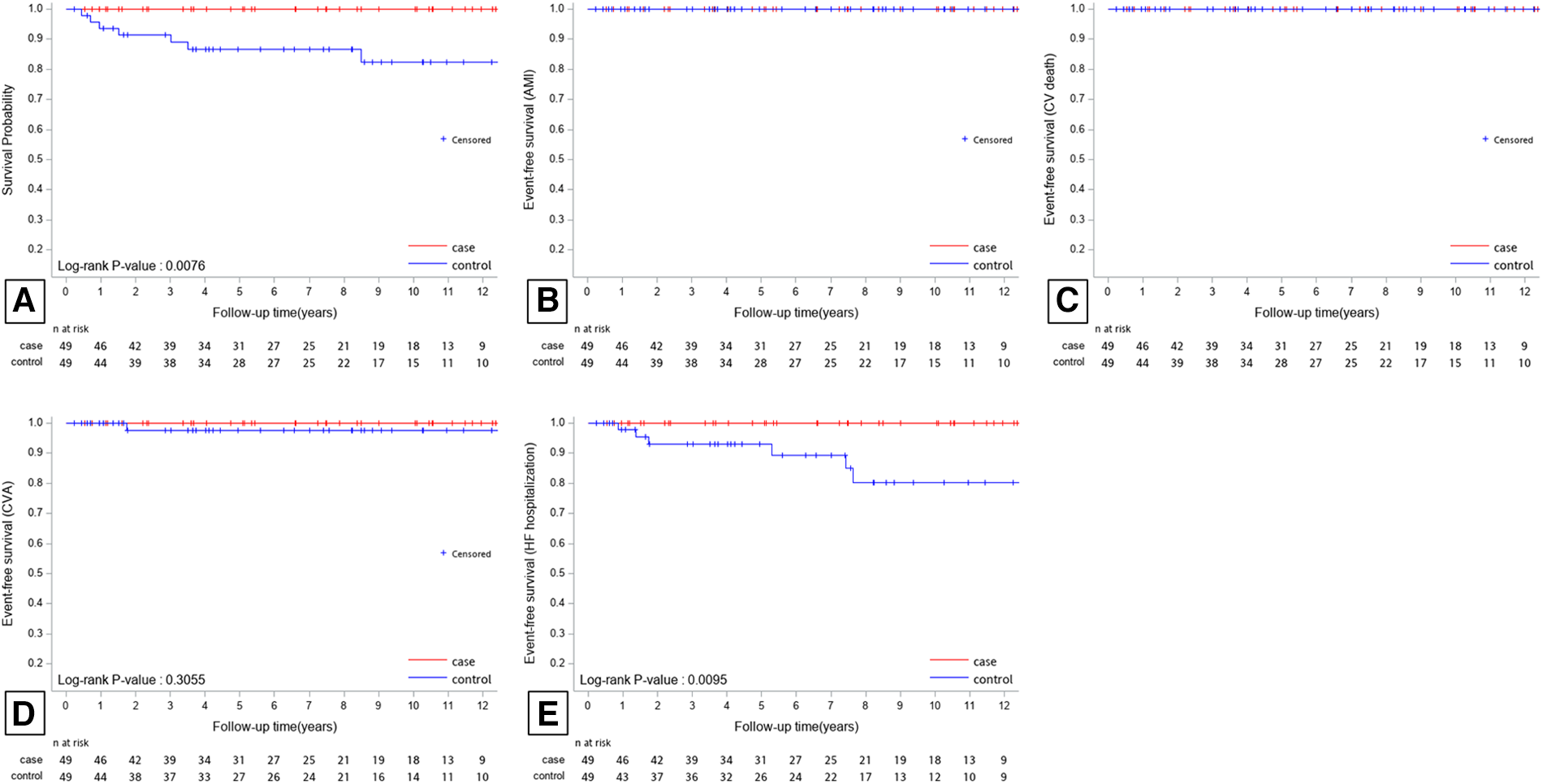 Kaplan-Meier survival plots for all-cause mortality (A), AMI (B), CV death (C), CVA (D), and HF hospitalization (E) of the PS-matched patients. All-cause mortality and HF hospitalization were significantly higher in PS-group 2 than in PS-group 1 during a mean follow-up period of 7.2 ± 4.2 years. AMI, acute myocardial infarction; CV, cardiovascular; CVA, cerebrovascular accident; HF, heart failure.