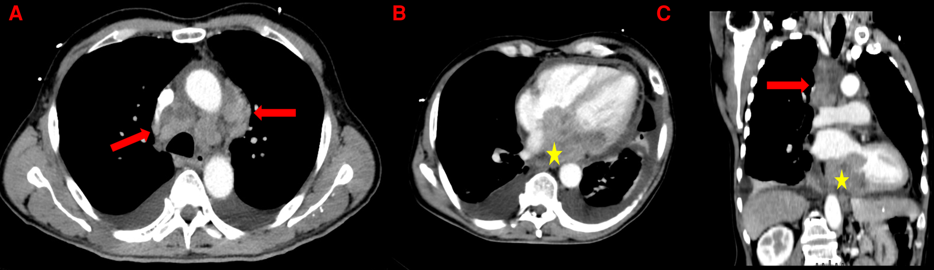 Thoracic CT-scan showing mediastinal lymphadenopathies (red arrows) and the left atrial mass (yellow stars) in axial view (A and B) and in coronal view (C). Presence of a bilateral pleural effusion and a thickened pericardium (B).