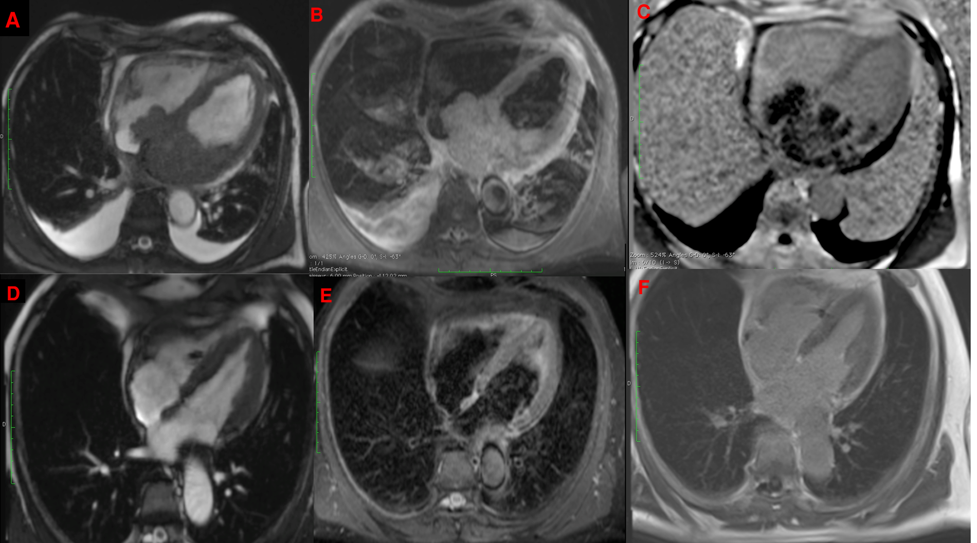 CMR showing a bulky mass extending throughout the left atrium, infiltrating the interatrial septum and right atrium, on cine imaging sequence (A), slightly hyperintense on fat-saturated T2-weighted imaging (B) with heterogeneous enhancement on late gadolinium enhancement sequences (C) with complete disappearance after 6 cycles of R-CHOP in the same sequences (D–F).