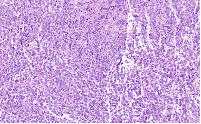 Hematoxylin and eosin stain: large lymphocytes cells with moderately abundant cytoplasm and oval nuclei containing several nucleoli corresponding to centroblasts.