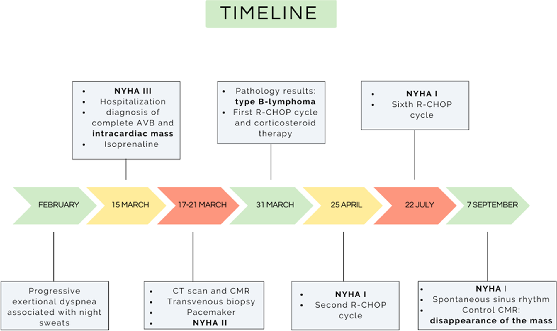 Timeline of the case. AVB, atrioventricular block; CMR, cardiac magnetic resonance; CT, computed tomography; NYHA, New York Heart Association.
