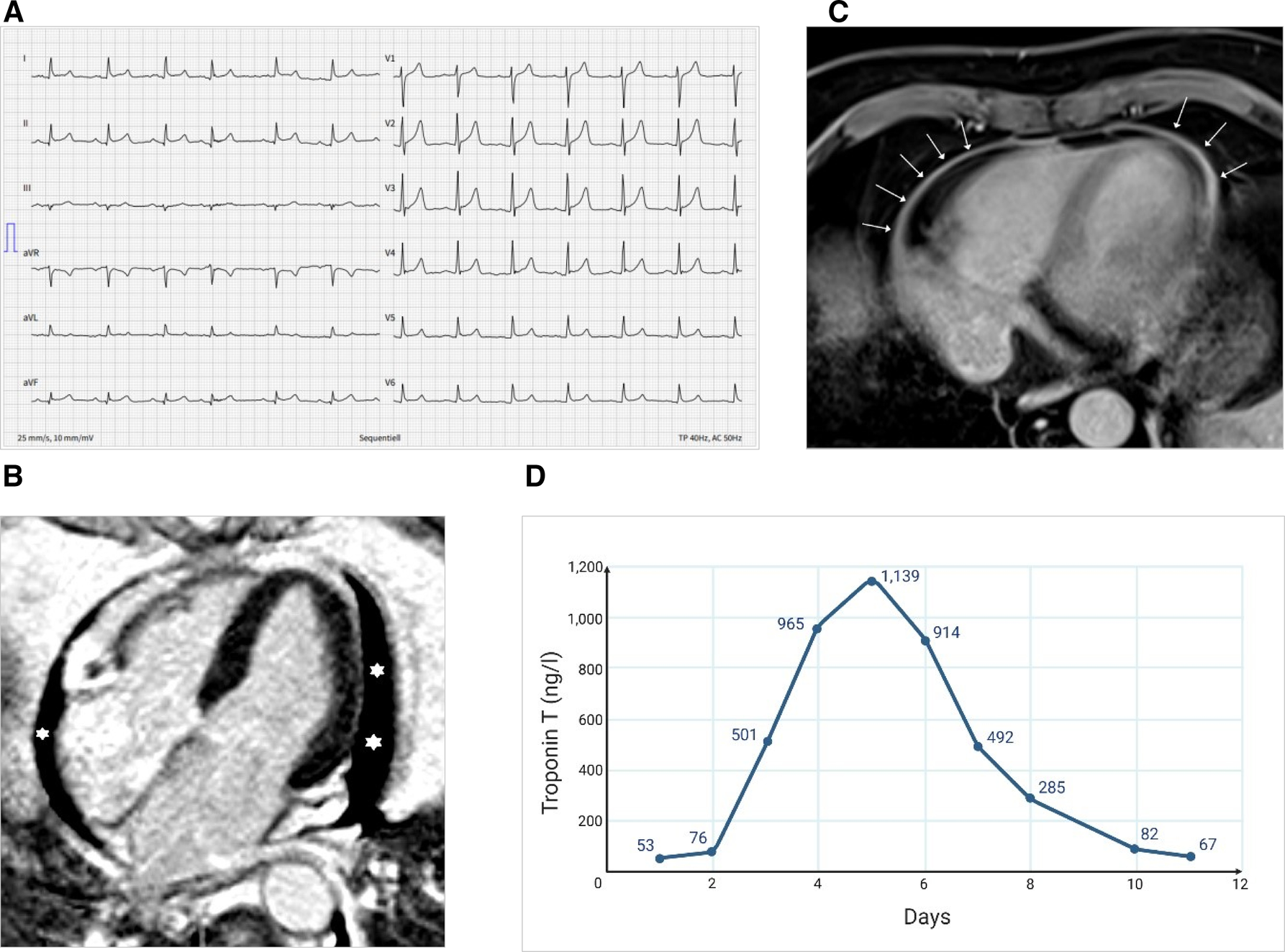 Electrocardiographic and imaging findings at admission and course of high-sensitive troponin T. (A) ECG showing diffuse concave ST-elevation (II, aVF, V3-6) and PQ-depression (II, aVF). (B) MRI showing pericardial effusion (asterisks) in the four-chamber view (late enhancement PSIR). (C) MRI showing pericardial enhancement (arrows) (axial T1 DIXON Water only, which is a fat-saturated, non-ECG-triggered). (D) Longitudinal evolution of the high-sensitive troponin T levels during the hospitalization (MRI done on day 3; i.e., troponin 501 ng/L).
