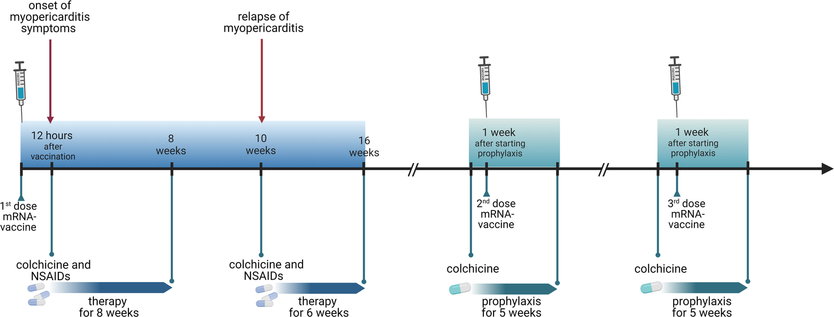 Due to the non-availability of alternative (non-mRNA) vaccines in Switzerland at that time and due to the high individual risk for severe COVID in this patient, we discussed a re-exposure with a second dose of an mRNA vaccine to complete the immunization. In order to prevent the re-occurrence of myopericarditis, we initiated a prophylactic therapy with colchicine 0.5 mg every 12 h, starting a week before the second dose. The rationale for using an inflammasome-inhibiting drug as prophylaxis was based on the data suggesting inflammasome-induced inflammation in the pathogenesis of mRNA vaccine-associated myocarditis (1), and data indicating a reduced risk of (inflammasome mediated) mRNA vaccine induced gout flares on colchicine treatment (2). Because the symptoms developed exceptionally rapidly after the first dose, we opted to monitor the patient in the hospital for 72 h. He received the second dose of mRNA-1273 in September 2021, 5 months after the first dose. No symptoms, arrhythmias, or ECG changes occurred. Colchicine was discontinued 4 weeks after the second dose. The clinical course was uneventful. SARS-CoV-2-S-IgG/M antibody levels 5 weeks after second vaccination were >2,500 U/mL. Subsequently, the patient could successfully complete the vaccination course with a third dose of mRNA-1273, again under colchicine prophylaxis for 4 weeks and without evidence of myopericarditis. Figure 2 shows the timeline of the clinical milestones of the patient.
