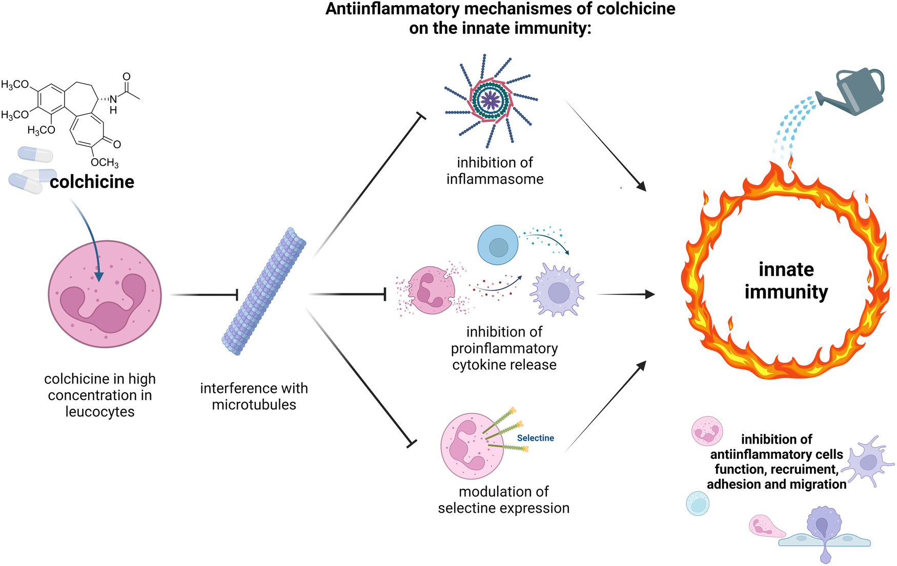 Mechanisms of action of colchicine on the innate immunity. High cytoplasmic concentration of colchicine especially in neutrophils are reached because of physiological reduced expression of transport P-glycoprotein (P-gp), which usually excretes drugs out of the cells. Colchicine inhibits assembly and attachment of microtubules. Consequently, several mechanisms of anti-inflammatory cell of the innate immunity are inhibited: inflammasome, a cytosolic multiprotein oligomers complex, which should activate an inflammatory cascade; release of proinflammatory cytokines (such as IL-1-β and IL-18) are downregulated; the expression E- and L-selectine on neutrophil surface, which promote the adhesion and the migration of those cells, are inhibited. This complex and sophisticated model results into inhibition of anti-inflammatory cells functions, recruitment, and motility of the innate immunity (22, 23, 25) (figure created with biorender.com).
