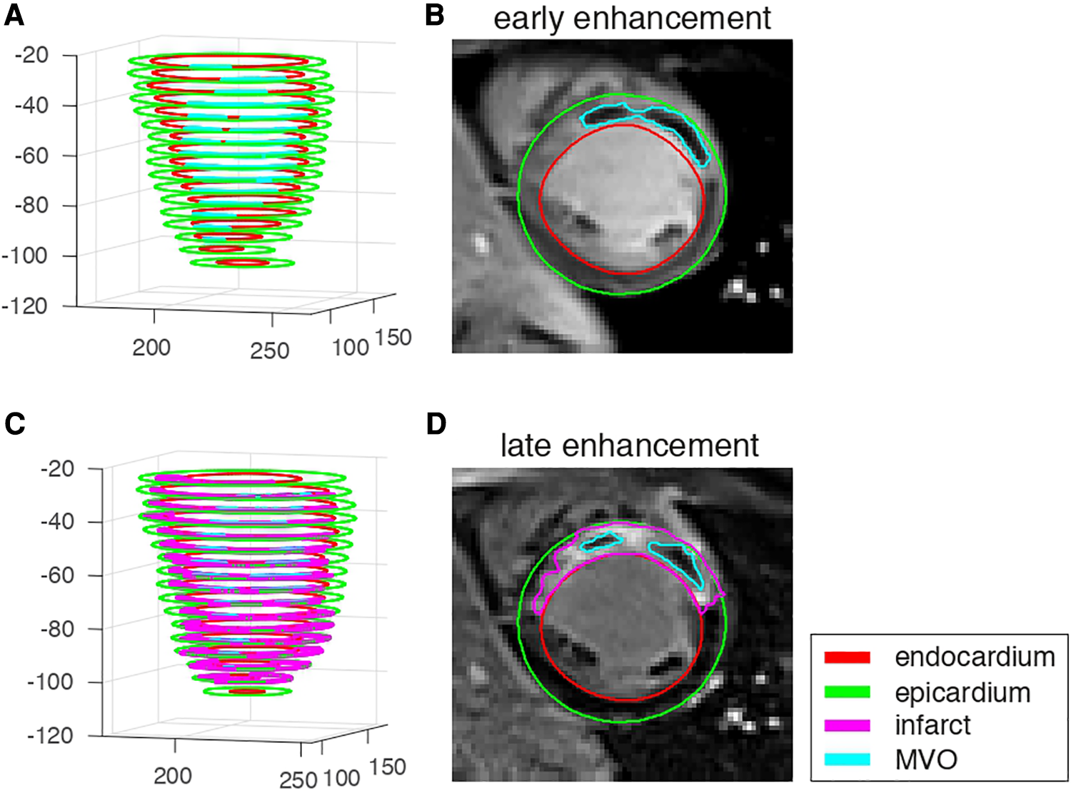 EGE and LGE data from one representative patient with microvascular obstruction and infarct. (A,C): 3D stacks of the segmented structures on each slice. (B,D): image data and segmented structures on a mid-cavity slice.