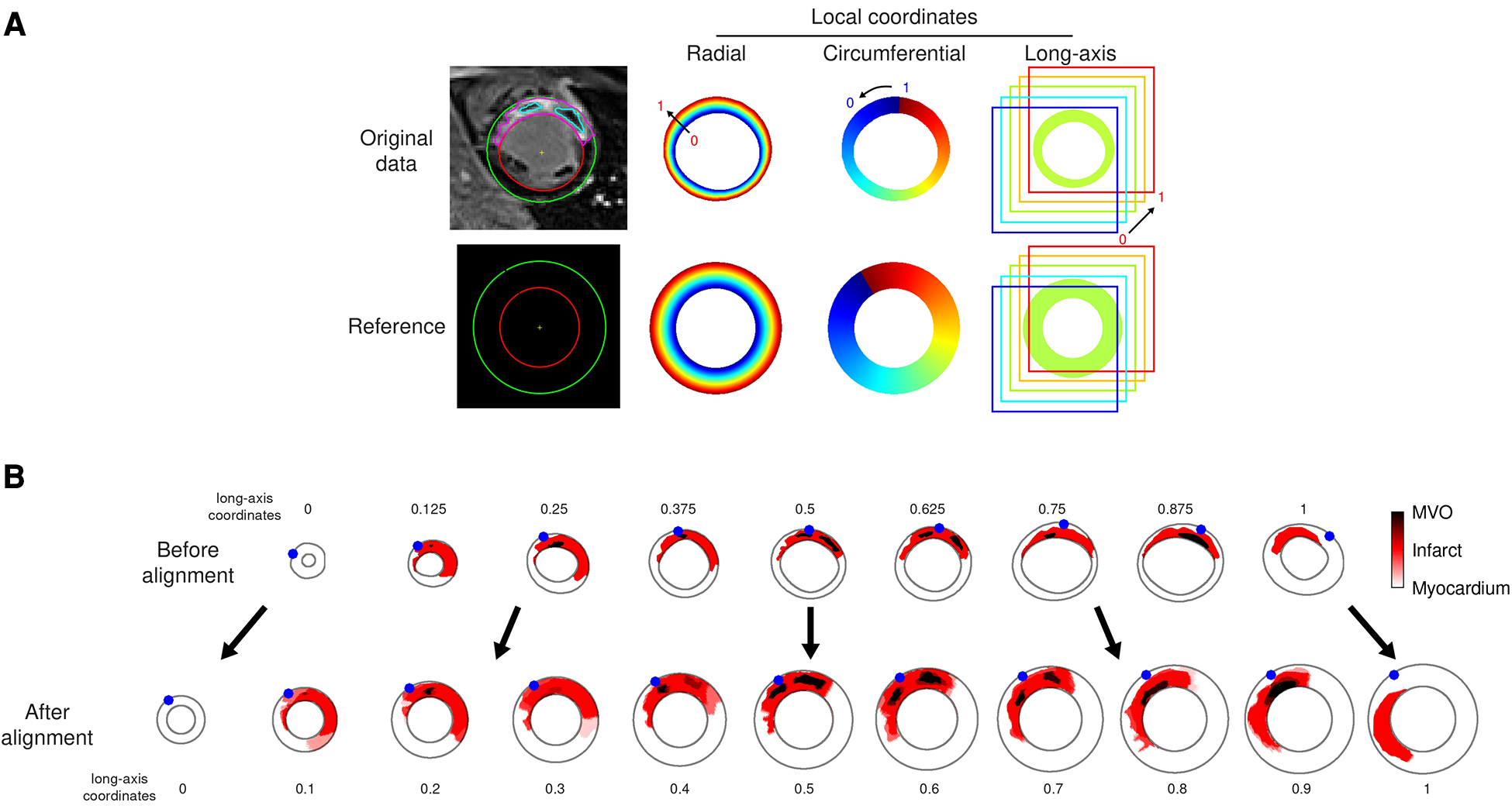 Data alignment steps illustrated on the representative patient from Figure 1. (A): automatically defined radial-circumferential-long axis coordinates on the studied subject’s anatomy, and on the reference used for the statistical analysis of the whole population. The color encodes the coordinates value ranging from 0 to 1 (long-axis coordinate = 0.625 for this slice). (B): standardization of the image data onto the reference (one slice out of two displayed for the sake of clarity, numbers indicate the standardized long-axis coordinates). The red and dark colors encode the segmented infarct and MVO, respectively. The blue dots stand for the location of the LV-RV junction on each slice.