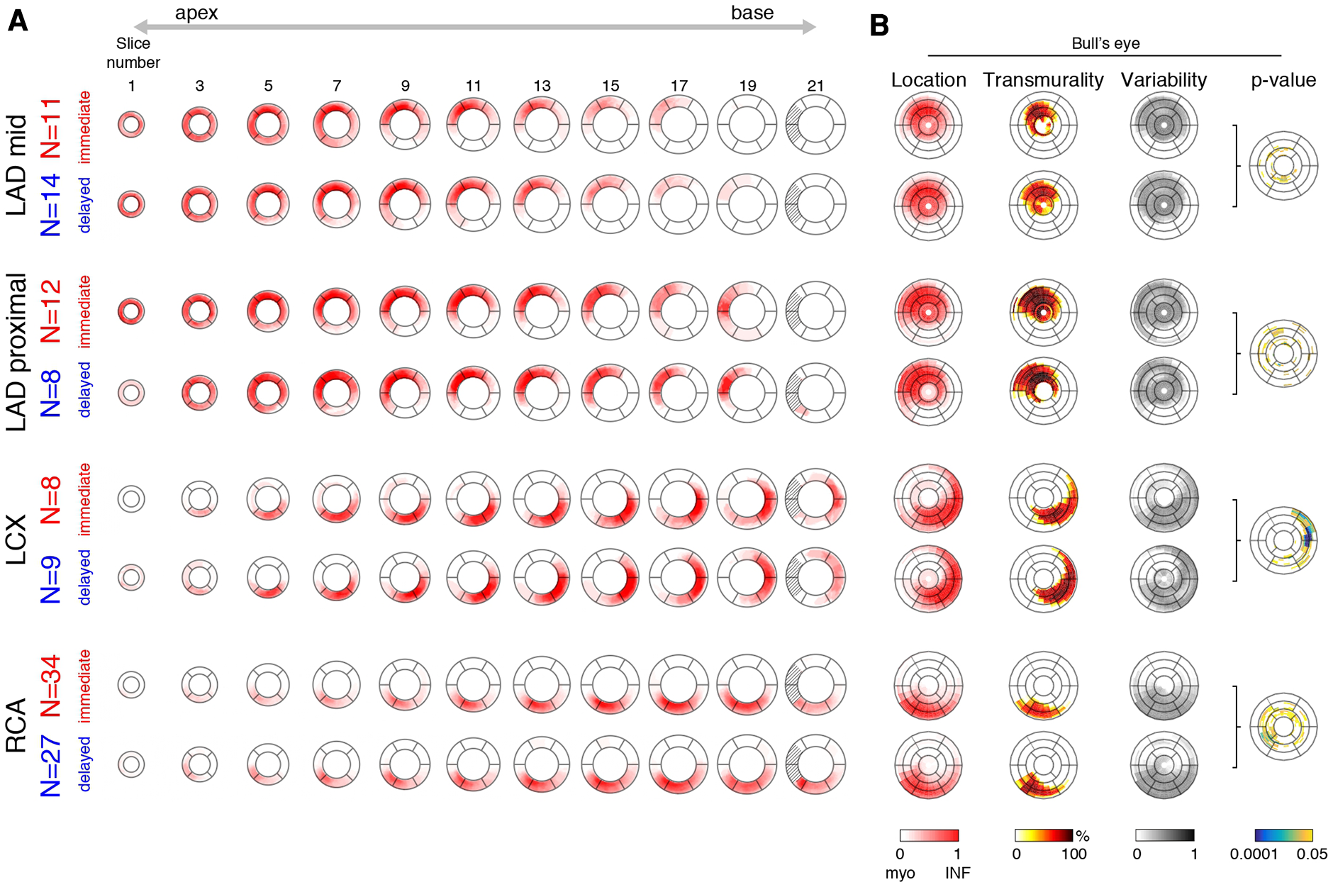 Representative infarct patterns depending on treatment (immediate vs. delayed) and territories (LAD mid or proximal, LCX, and RCA). (A): average pattern for each subgroup, from apex to base (one slice out of two displayed for the sake of clarity). The dashed region corresponds to incomplete myocardium at the basal level. (B): Bull’s eye representation that summarizes this information across slices: infarct location and variability, transmurality, and statistical differences between the two treatment options (p-value displayed in a logarithmic color scale).
