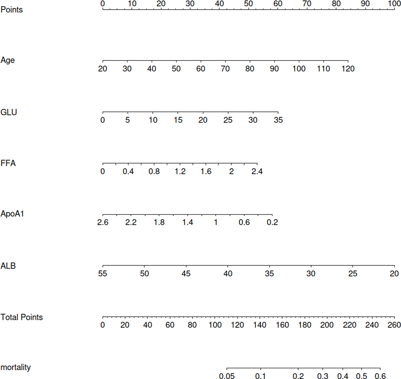 Under acute ischemia and hypoxia, glucose metabolism characterized by low oxygen consumption is increased to meet the ATP demands of the heart. However, it inhibits the energy supply of fatty acids, causing the accumulation of lipids and inducing lipotoxicity. Studies have shown that lipid metabolism toxicity is an independent risk factor for the aggravation of CHD, and the increase of free fatty acid (FFA) level is an independent risk factor and independent diagnostic marker of acute myocardial infarction (4). The changes of metabolic status and lipid deposition of vascular wall in patients with coronary heart disease lead to endothelial cell dysfunction, macrophage activation and plaque instability, which ultimately lead to adverse cardiovascular events. Research shows that age has a significant impact on myocardial infarction and is a risk factor for atherosclerosis (5). ApoAl is the main apolipoprotein of high-density lipoprotein (HDL-C). ApoAl can transport cholesterol from the body tissues to the liver for catabolism, thus preventing cholesterol from depositing in the blood vessel wall. Therefore, ApoAl is an anti atherosclerotic indicator in vivo, which can inhibit the formation of atherosclerotic plaque. The study confirmed that ApoA1 is superior to HDL-C in evaluating the severity of coronary artery injury (6). In addition, studies have shown that the level of ALB and GLU at admission is an independent predictor of cardiovascular death in patients with myocardial infarction (7–9). Therefore, the risk indicators of FFA, ApoA1, GLU, age and ALB selected in this study have clinical significance.