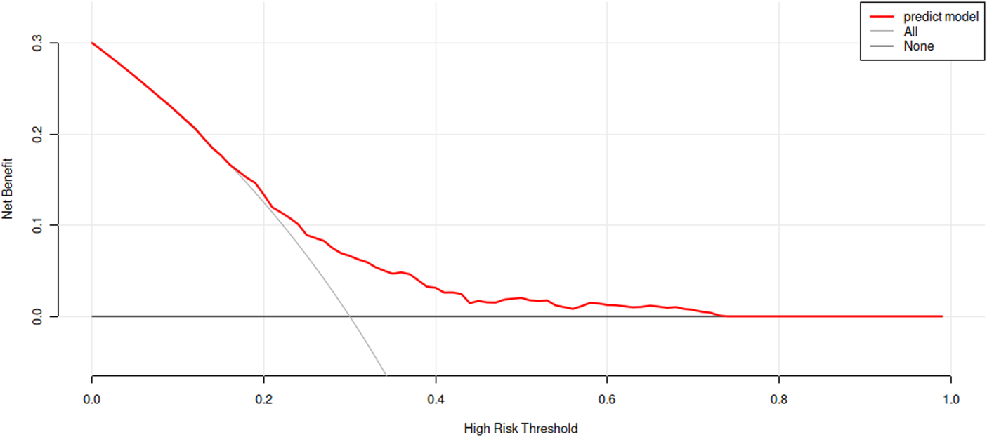 In summary, age, ALB, FFA, ApoA1 and GLU are independent factors for MACE during hospitalization in CHD patients, and a nomogram model for MACE during hospitalization risk prediction in CHD patients constructed based on the above factors has good discrimination, calibration,and clinical effectiveness and can be used as an effective tool for early clinical prediction of in-hospital MACE risk in CHD patients. The ROC curve is used to establish the best boundary value of the five risk factors, which can quantitatively present the changes of cardiac energy metabolism substrate, and finally achieve prediction of MACE during hospitalization conveniently and sensitively.