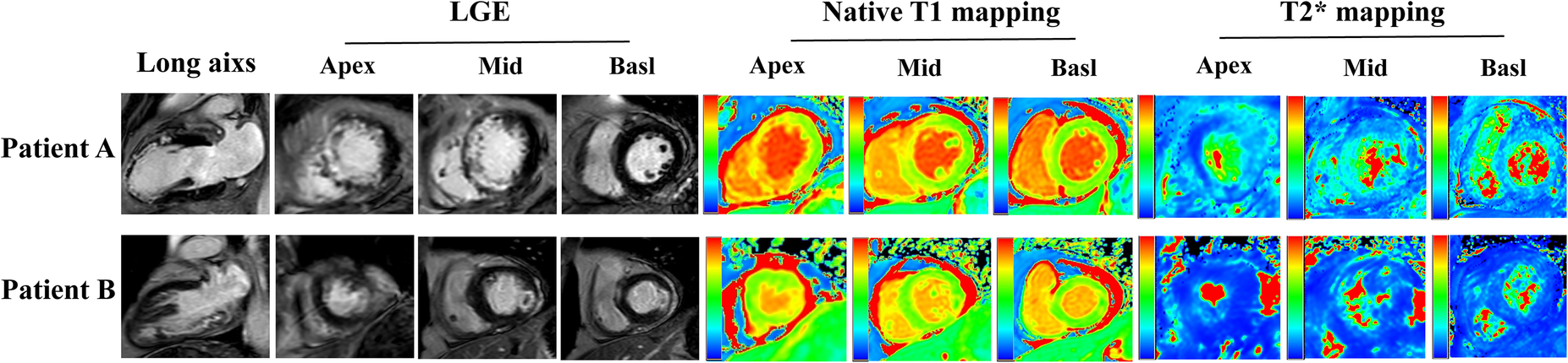 CMR images from two patients with STEMI treated by PPCI. Short axis slices in the basal, middle and apical region and long axis long axis two-chamber heart are showed. Patient A: A 57-year-old patient with anterior STEMI treated by PPCI and with GSDMD concentrations ≧ median (13 ng/L). The CMR images on day 2 showing transmural infarction in the anterior wall with MVO, and the Native T1 and T2* maps represent myocardial damage and intramyocardial hemorrhage. Patient B: A 49-year-old patient with lateral STEMI treated by pPCI and with GSDMD concentrations< median (13ng/L). The CMR images on day 2 manifesting infarction in the lateral wall with MVO, and the Native T1 and T2* maps represent myocardial damage and intramyocardial hemorrhage.