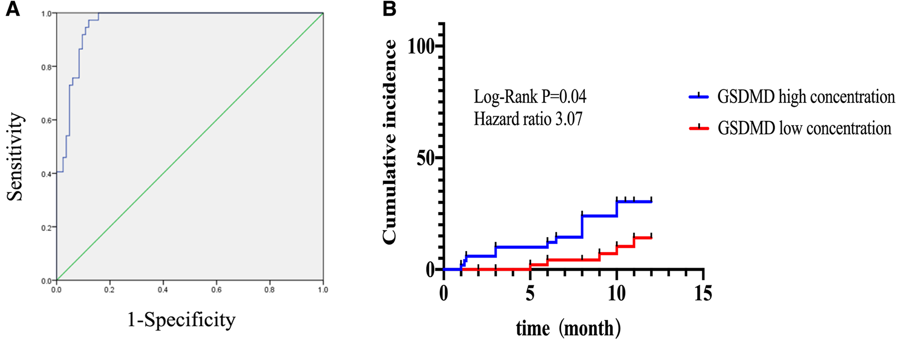 Microvascular obstruction was observed in 37 patients (31%). GSDMD concentrations ≧ median (13 ng/L) in patients were associated with a higher risk of microvascular obstruction and IMH (46% vs. 19%, P = 0.003; 31% vs. 13%, P = 0.02, respectively), as well as with a lower LVEF both in the acute phase after infarction (35% vs. 54%, P < 0.001) and in the chronic phase (42% vs. 56%, P < 0.001), larger IS in the acute (32% vs. 15%, P < 0.001) and in the chronic phases (26% vs. 11%, P < 0.001), and larger left ventricular volumes (119 ± 20 vs. 98 ± 14, P = 0.003) by CMR. Univariable and multivariable Cox regression analysis results showed that patients with GSDMD concentrations ≧ median (13 ng/L) had a higher incidence of MACE (P < 0.05).