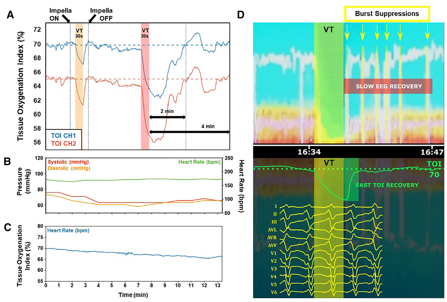 – In panel A, NIRS perfusion is measured on two separate channels, from which the tissue oxygenation index (TOI) is determined. Normal TOI values range from 60%–80%, and a drop of >20% from baseline values, or a value below 55%, may indicate poor oxygen delivery. Two 30 s VT episodes are simulated by rapid ventricular pacing (220 ms cycle length). During the first VT episode, Impella support is active, and only a moderate TOI drop is observed on both channels, with fast and complete recovery after cessation of VT. Conversely, during the second VT episode, Impella support is disabled and a profound drop in TOI is observed, taking 2 min to recover post-cessation of VT, and remaining unstable for an additional 2 min.