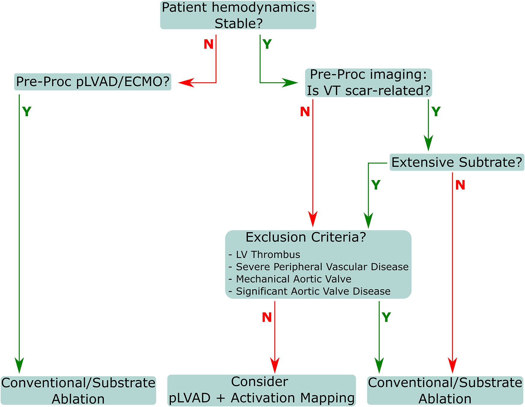 Patient evaluation flow for VT. VT, ventricular tachycardia; pLVAD, percutaneous left ventricular assistance device; ECMO, extracorporeal membrane oxygenation; LV, left ventricle.