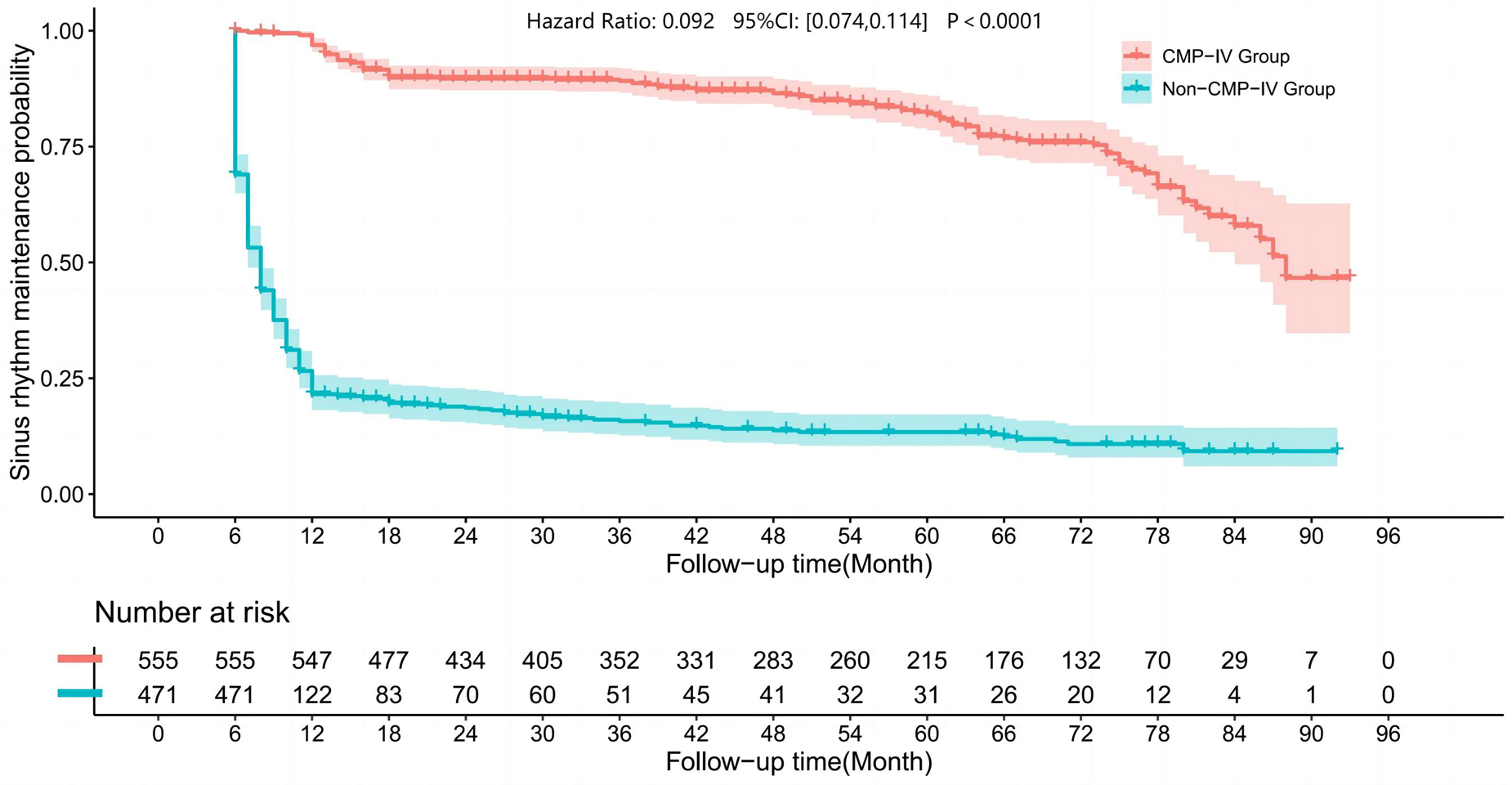 Baseline, hospitalization and follow-up characteristics for the CMP-IV group and Non-CMP-IV group are shown in Table 1. In a total of 1,026 patients, AF recurred in 117 of 555 (21.08%) in the CMP-IV group (the detailed information of baseline characteristics is presented in Supplementary Table S1) and 402 of 471 (85.35%) in the Non-CMP-IV group (the detailed information of baseline characteristics is presented in Supplementary Table S2). The median follow-up time was 5 years. There was no significant difference in age, duration of AF, and follow-up time between the two groups.