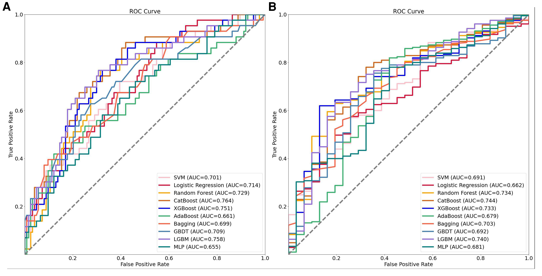 We developed ten common machine learning models for the two groups respectively, including Support Vector Machine (SVM) (23), Logistic Regression (LR) (24), eXtreme Gradient Boosting (XGBoost) (25), Random Fores (RF) (26), Category Boosting (CatBoost) (27), Adaptive Boosting (AdaBoost) (28), Bootstrapped aggregation (Bagging) (29), Gradient boosting decision trees (GBDT) (30), Light Gradient Boosting Machine (LightGBM) (31) and Multilayer perceptron (MLP) (32). The optimal hyperparameter combination in machine learning models was determined through grid search. To evaluate the performance of these models, we performed five-fold cross-validation on the training data and calculated evaluation metrics including F1 score, Accuracy, Recall, Precision, and area under the curve (AUC), along with 95% confidence intervals. These metrics allowed us to assess the overall performance of the models and determine their suitability for use in clinical decision-making. The F1 score is the harmonic mean of precision and recall and is a useful metric for balancing the trade-off between these two metrics. Accuracy measures the percentage of correct predictions. Recall measures the percentage of true positive predictions among all actual positive cases. Precision measures the percentage of true positive predictions among all positive predictions. The Receiver Operating Characteristic (ROC) curve for each model was plotted in CMP-IV group and Non-CMP-IV group, using a 7:3 split for training and testing, to more clearly visualize the trade-off between true positive rate and false positive rate and evaluate the AUC (33).