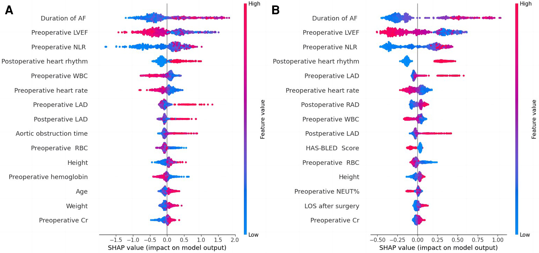 The 5-year sinus rhythm maintenance rate in the CMP-IV group was 82.13% (95% CI: 78.51%, 85.93%), while in the Non-CMP-IV group, it was 13.40% (95% CI: 10.44%, 17.20%). The eXtreme Gradient Boosting (XGBoost), LightGBM, Category Boosting (CatBoost) and Random Fores (RF) models performed the best in the CMP-IV group, with area under the curve (AUC) values of 0.768 (95% CI: 0.742, 0.786), 0.766 (95% CI: 0.744, 0.792), 0.762 (95% CI: 0.723, 0.801), and 0.732 (95% CI: 0.701, 0.763), respectively. In the Non-CMP-IV group, the LightGBM, XGBoost, CatBoost and RF models performed the best, with AUC values of 0.738 (95% CI: 0.699, 0.777), 0.732 (95% CI: 0.694, 0.770), 0.724 (95% CI: 0.668, 0.789), and 0.716 (95% CI: 0.656, 0.774), respectively. Analysis of feature importance and SHAP revealed that duration of AF, preoperative left ventricular ejection fraction, postoperative heart rhythm, preoperative neutrophil-lymphocyte ratio, preoperative left atrial diameter and heart rate were significant factors in AF recurrence.