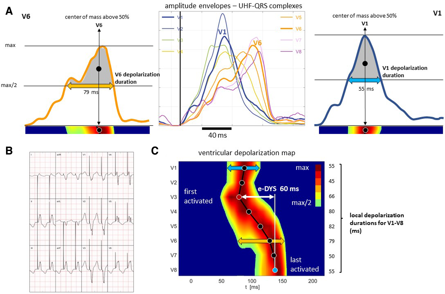 Presentation of amplitude envelopes of UHF-QRS complexes, local activations, and local depolarization durations calculation; patient with RVSP. (Panel A) amplitude envelopes of V1–V8 UHF-QRS complexes (in the middle), local activations (solid circles) computed as the center of mass above the 50 percent threshold of the baseline to peak amplitude, and local depolarization durations determined as the depolarization duration at the 50 percent threshold of the baseline to peak amplitude for leads V6 (left) and V1 (right). (Panel B) 12-lead ECG. (Panel C) ventricular depolarization map with visualization of the timing of local activations (solid circles) in leads V1–V8, electrical ventricular dyssynchrony e-DYS, and local depolarization duration values. For details, see Jurak, P. et al. (2020).