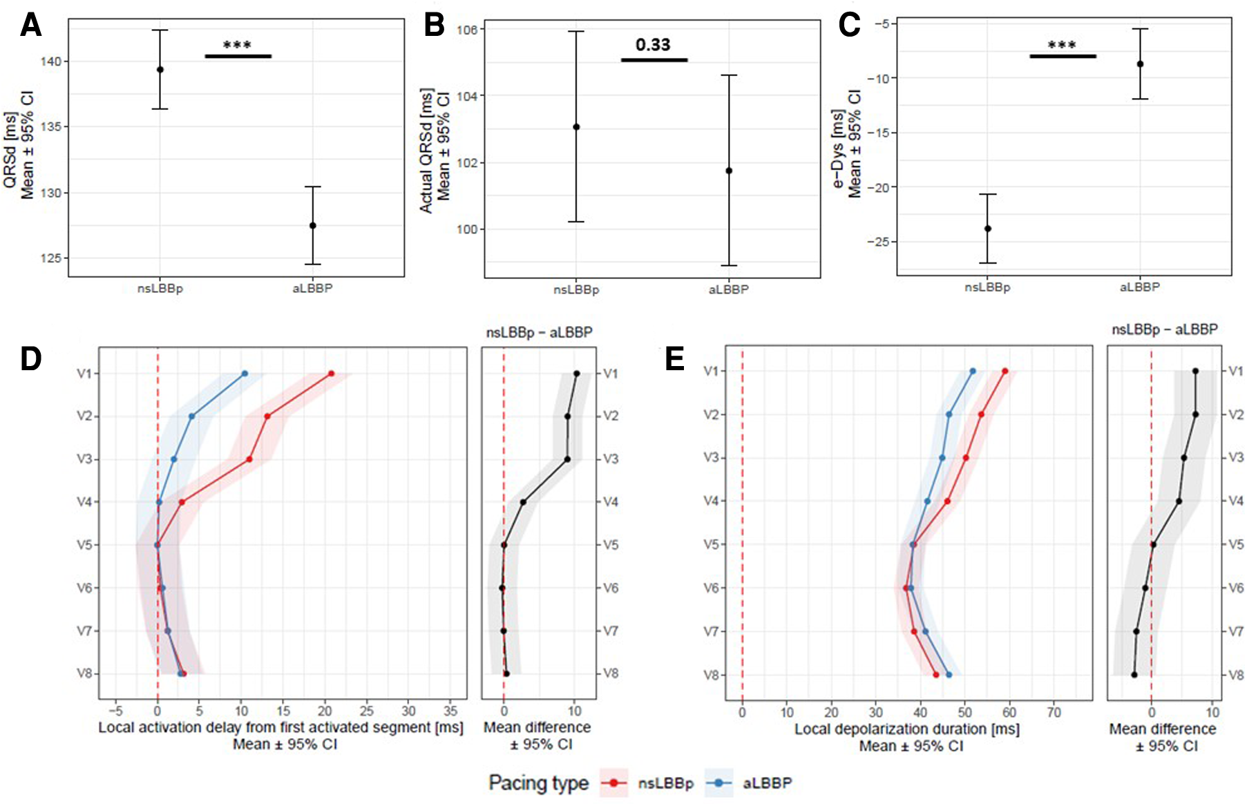Panel A: QRSd, actual QRSd (Panel B), e-DYS (Panel C), local activations in V1–V8 (first activated segment was placed at 0 ms) (Panel D), and in Panel E, local depolarization durations in V1–V8 between nsLBBP and aLBBP. ***p < 0.001.