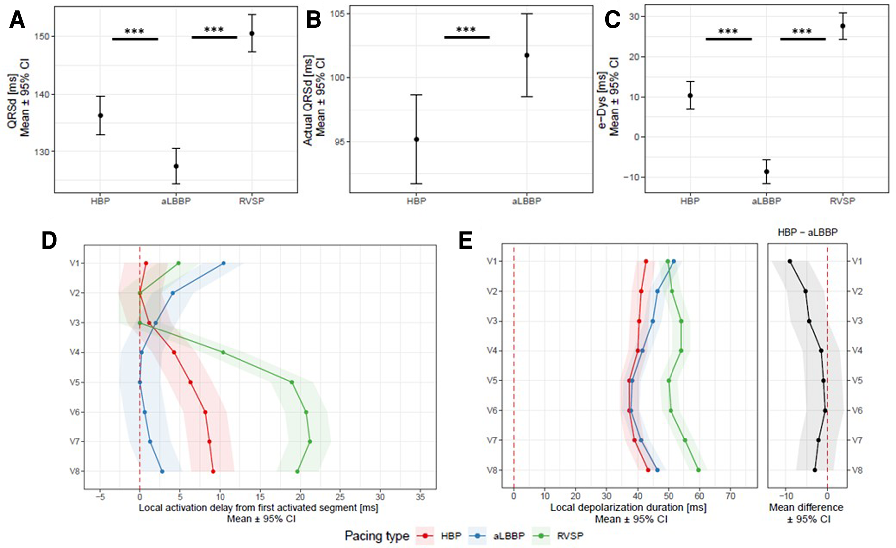 Panel A: QRSd, actual QRSd (Panel B), e-DYS (Panel C), local activations in V1–V8 (first activated segment was placed at 0 ms) (Panel D), and in Panel E, local depolarization durations for V1–V8 between HBP, aLBBP, and RVSP. ***p < 0.001.