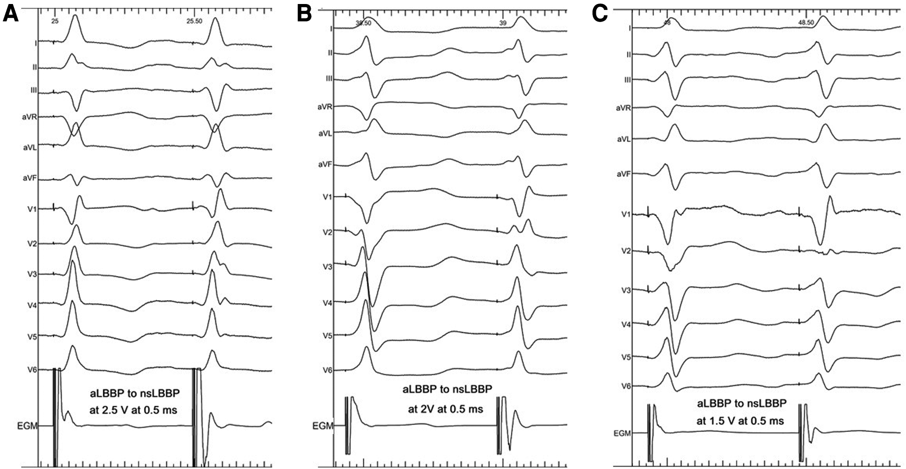 Change from aLBBP with a late r/R morphology to nsLBBP (Panel A), aLBBP with a QS morphology to nsLBBP (Panel B), and aLBBP with Qrs morphology to nsLBBP (Panel C).