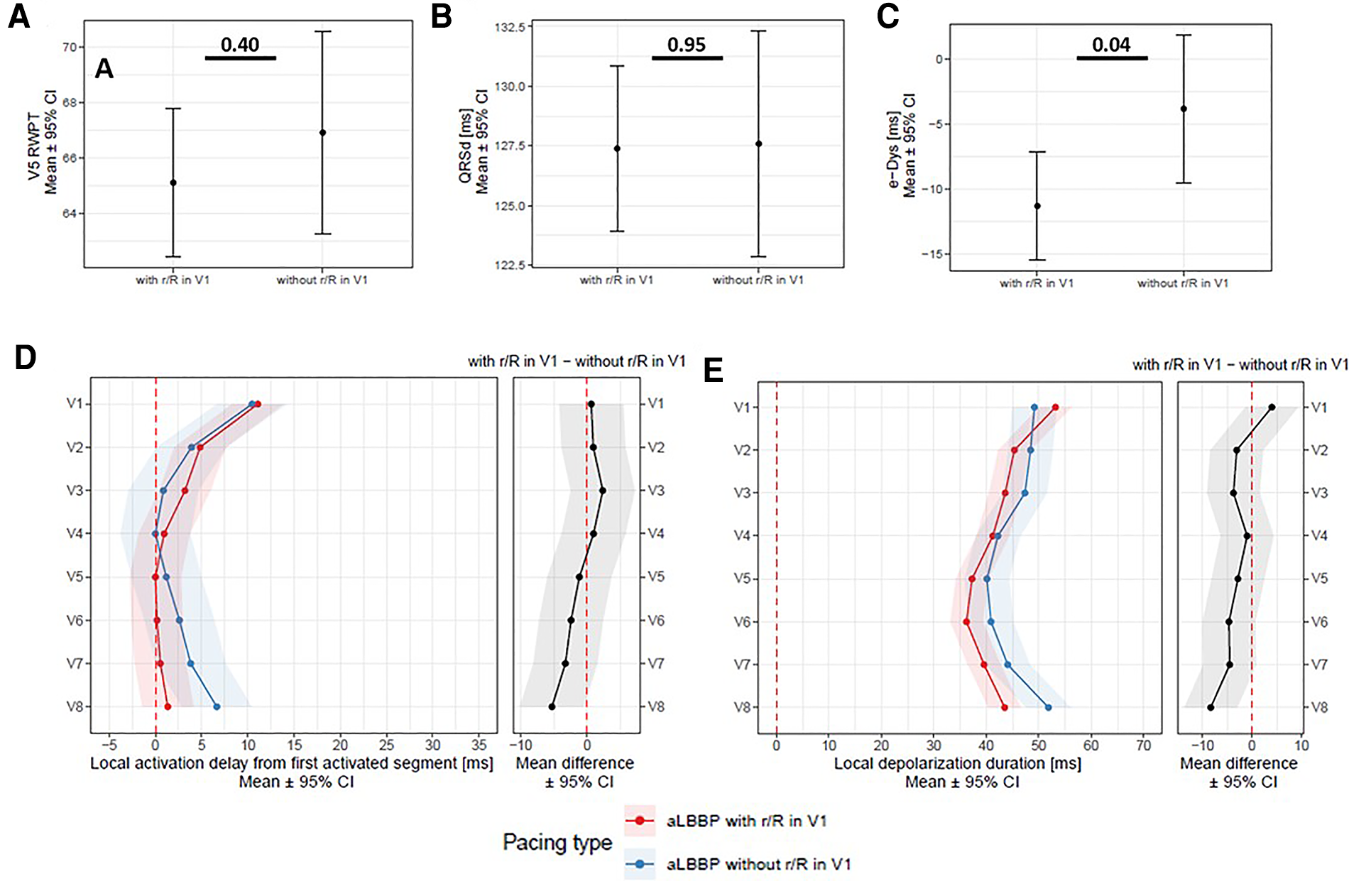 Panel A: V5RWPT, QRSd (Panel B), e-DYS (Panel C), local activations in V1–V8 (first activated segment was placed at 0 ms) (Panel D), and in Panel E, local depolarization durations in V1–V8 between aLBBP with r/R and without r/R in lead V1.