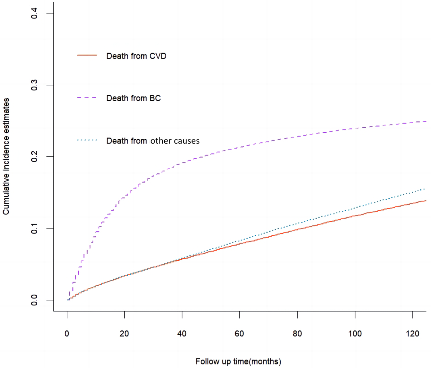 The primary outcome was death from CVD. As recorded in the SEER database, CVD-related death was defined by the following six causes: (1) disease of heart, (2) hypertension without heart disease, (3) cerebrovascular disease, (4) atherosclerosis, (5) aortic aneurysm and dissection, (6) other diseases of arteries, arterioles, and capillaries. Competing events against cardiovascular death in our study consisted of deaths from BC and other non-CVD related causes. Follow-up time was calculated from the initial diagnosis of BC until the patient was lost to follow-up, date of death, or final follow-up date.
