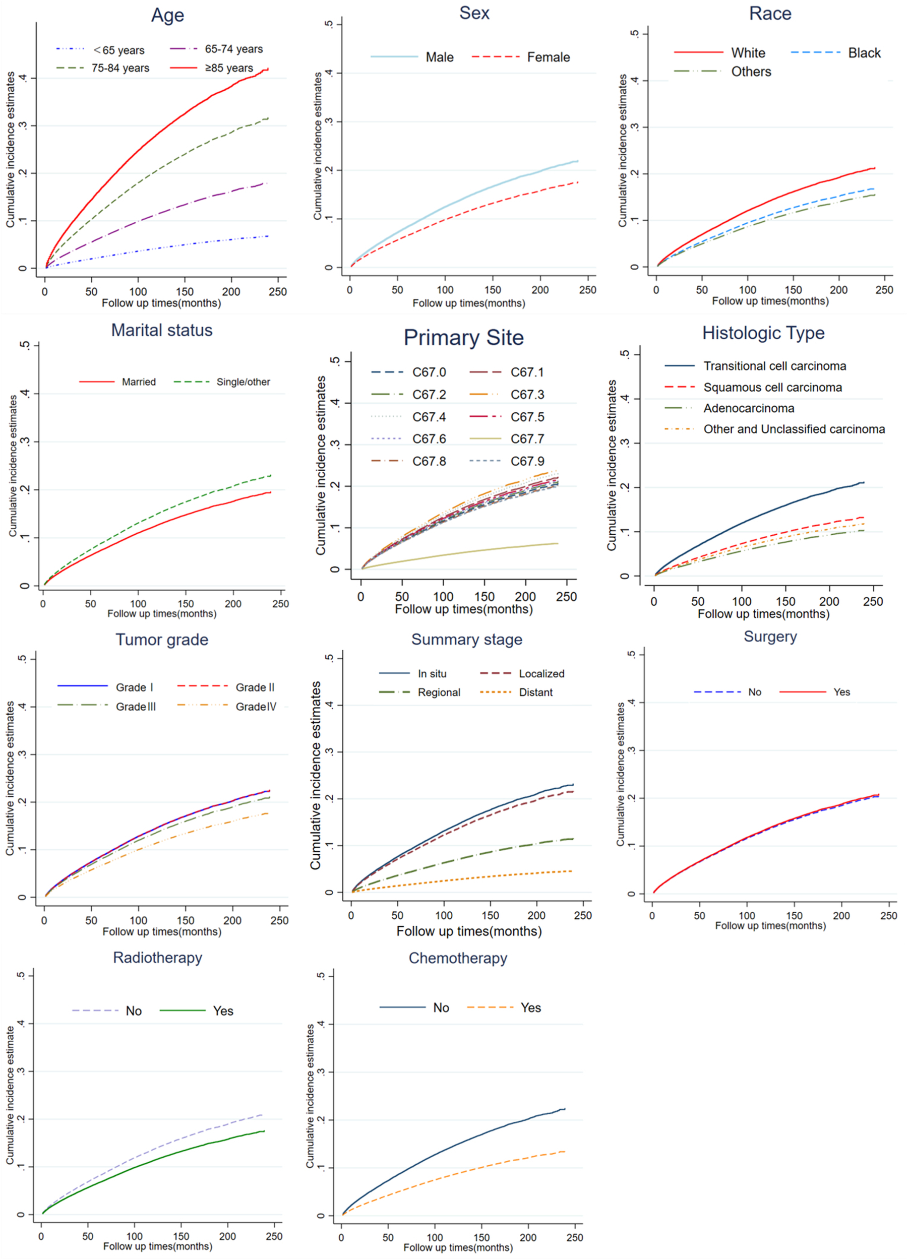 Patients diagnosed with BC from 2000 to 2017 from 17 population-based cancer registries were included in our study. The inclusion criteria for our study were as follows: (1) case selection based on site and morphology, with primary site labeled as “C67.0–9”; (2) availability of active follow-up information and defined causes of mortalities; (3) BC was the only one and primary cancer. Next, we collected the following informations of included patients: age, sex, race, marital status, primary site, histologic type, tumor grade, summary stage, surgery, radiotherapy, chemotherapy, survival months, and causes of death. Patients with incomplete data about any of the aforementioned variables were excluded.