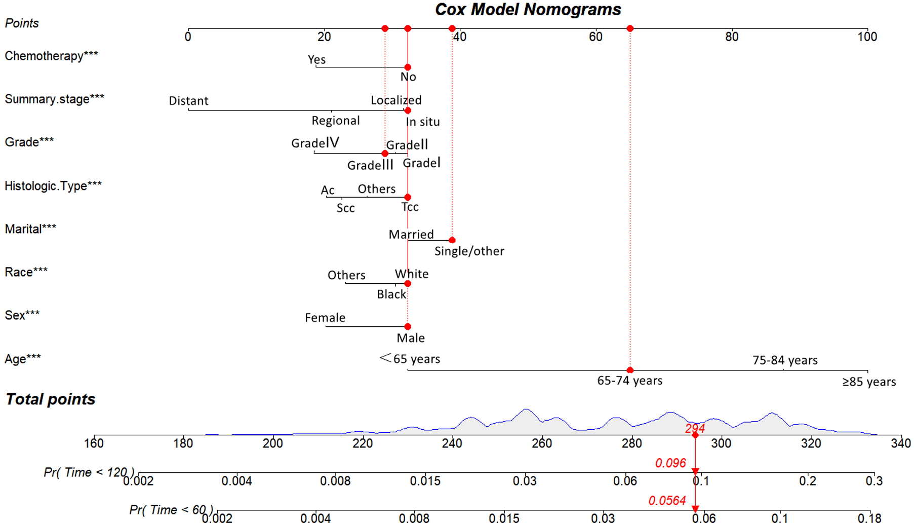 No statistically significant differences in any of the analyzed variables, including age, sex, race, marital status, primary site, histologic type, tumor grade, summary stage, surgery, radiotherapy, chemotherapy, and causes of death, were observed between the training and validation cohorts (Table 1).