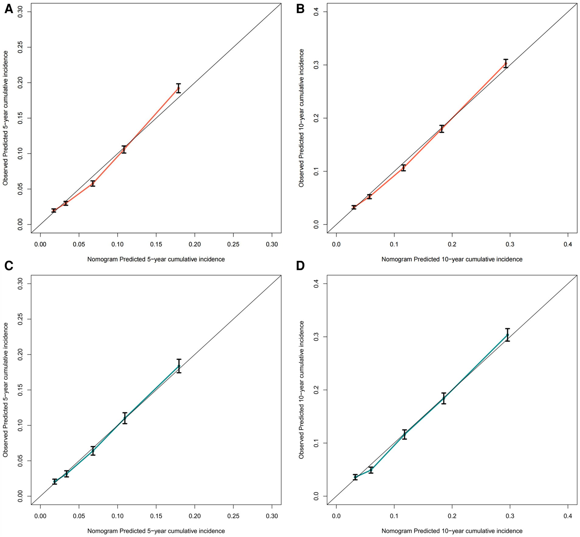 The patients included in this study were randomly assigned to either training or validation cohort in a 7:3 ratio. Differences in baseline characteristics between the two groups were assessed using the chi-squared test. To assess the interaction between BC and CVD-related deaths, we calculated the cumulative incidence function (CIF) to determine the probabilities of each event at 5- and 10-year. Fine and Gray's subdistribution proportional hazards model was conducted on the training cohort to identify the independent risk factors of death from CVD and then construct a novel competing risk model to predict the probabilities of CVD-related death at 5- and 10-year for patients with BC. Then to measure the discriminative performance of the model, we calculated the bootstrap-corrected concordance index (C-index) and constructed the receiver operating characteristic (ROC) curves based on the area under the curve (AUC) values of the corresponding variables. The calibration curves and decision curve analysis (DCA) were performed to verify the consistency and investigate the clinical utilities and net benefits of this model.