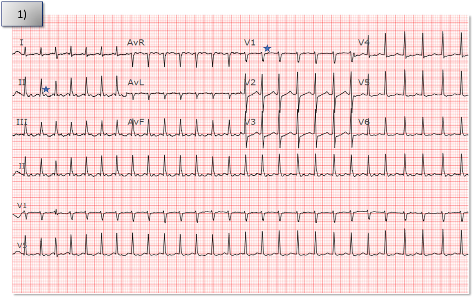 Index electrocardiogram from patient's presentation to the hospital showed narrow complex tachycardia with a short RP interval at a rate of 163 bpm. Star denotes p waves in V1 and lead II.