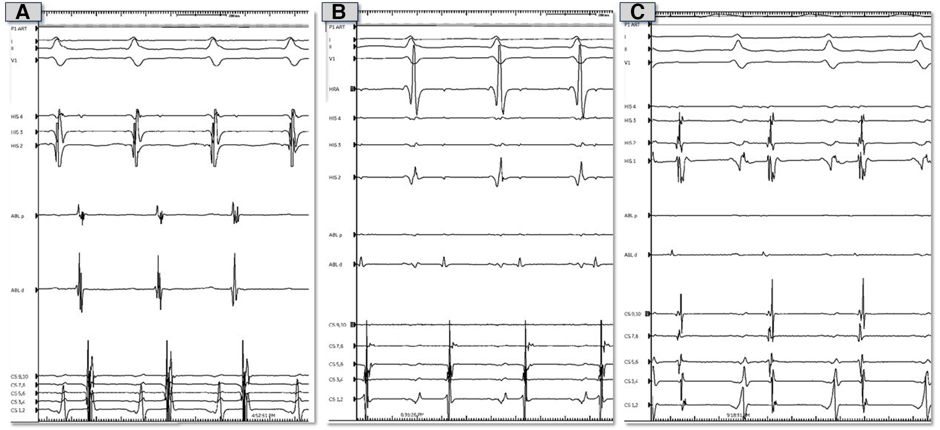 Representative electrocardiograms and intracardiac electrograms from electrophysiology study prior to ablation. (A) Tracings during tachycardia from theright atrial septum. (B) Tracings during tachycardia from the non-coronary sinus of Valsalva. (C) Tracings during tachycardia from the left atrial septum.