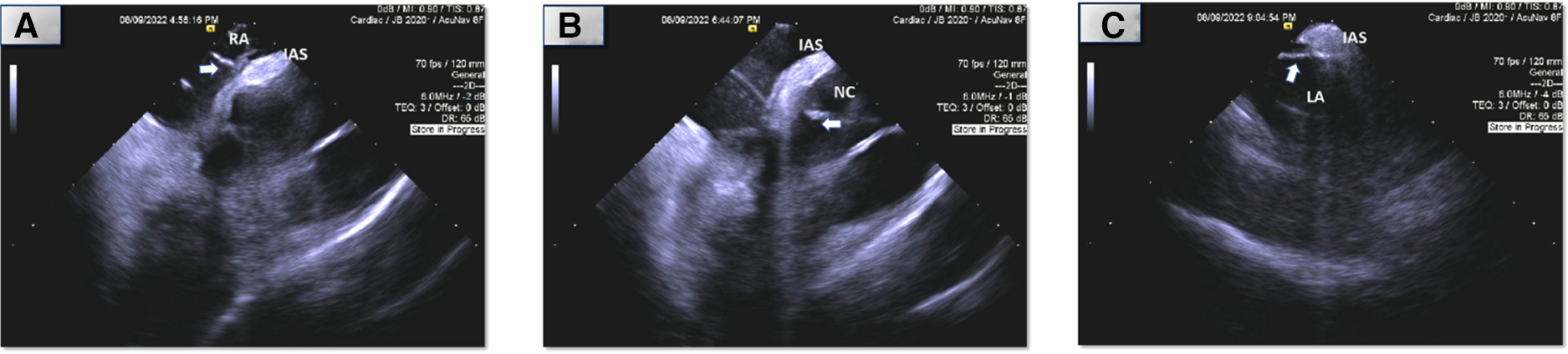 Intracardiac (ICE) echocardiography of ablation sites (arrow: ablation catheter, RA, right atrium; NC, non-coronary sinus of Valsalva; LA; atrial septum; IAS, interatrial septum). *Images are placeholders for videos which are attached. (A) Right atrial septum. (B) Non-coronary sinus of Valsalva. (C) Left atrial septum.