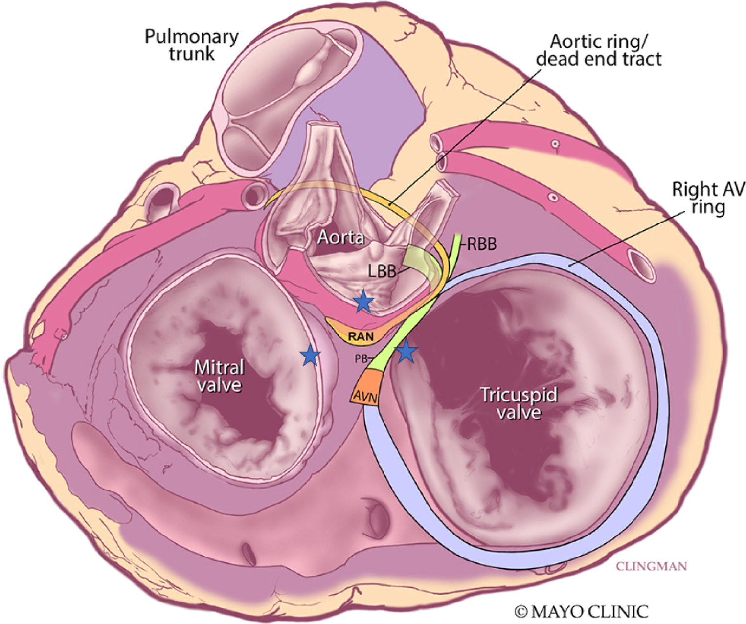 Superior view of the retroaortic node (RAN) and neighboring structures. Star represents vantage points of ablation to the area. AVN, atrioventricular node; PB, penetrating bundle; RBB, right bundle branch; LBB, left bundle branch. Adapted from Yanni et al. (14).
