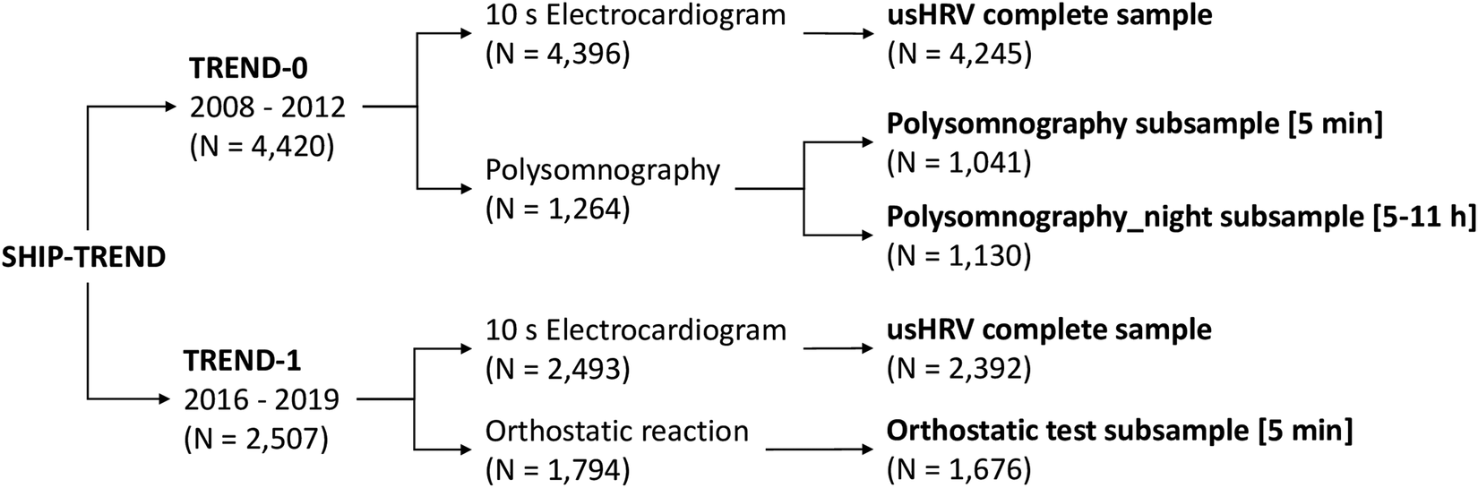 SHIP-TREND-0: 12 missing values in PSG subsample subsample, 190 missing values in usHRV complete sample; SHIP-TREND-1: 2 missing values in usHRV complete sample.