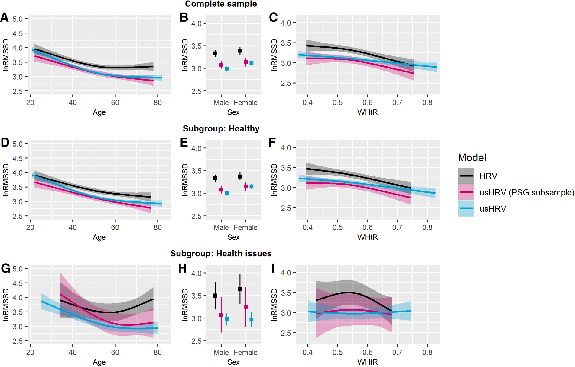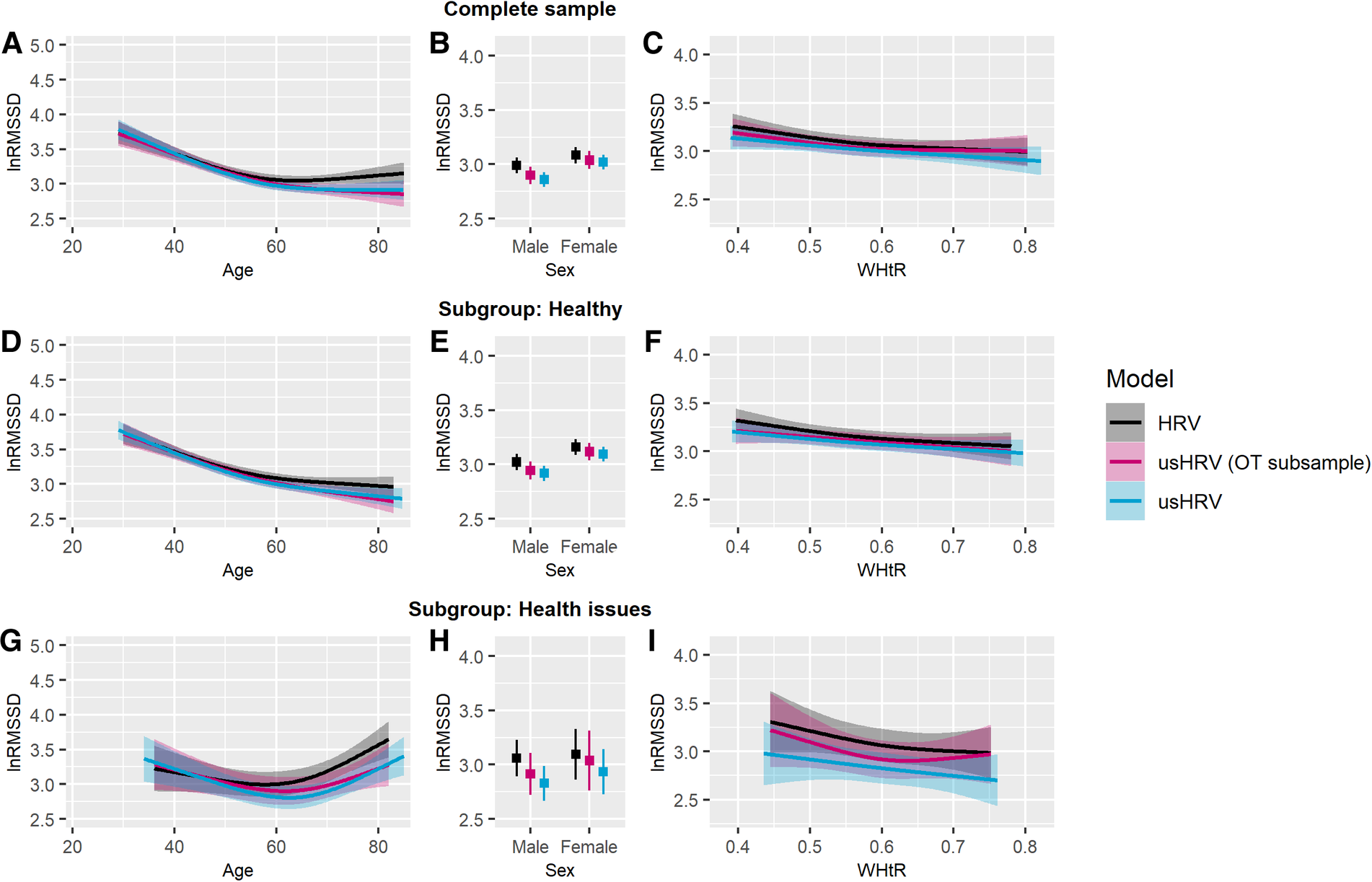 All statistical analyses were performed using R 4.2.1 (62). For all regression analysis, the HRV, respectively usHRV, parameter RMSSD was transformed using the natural logarithm to ensure normal distribution (lnRMSSD). Moreover, for modeling non-linear associations, restricted cubic splines, implemented in the rms package (63), were used and effects of single variables were assessed by Analyses of variance of type 2. Overall, a significance level of p < .05 was used. Sample sizes for linear regressions varied slightly due to missing values (max. 1.27% missing cases).
