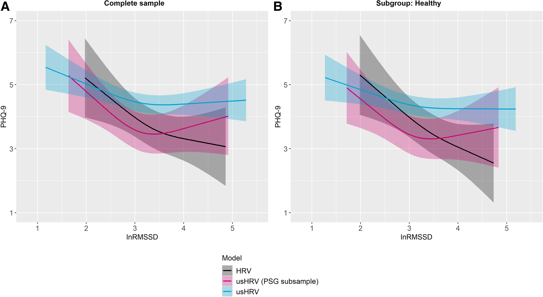 In the last step, the association between the PHQ-9 sum score (outcome) and lnRMSSD (non-linear) was evaluated by using linear regression models and a set of covariates (WHtR (non-linear), HR (non-linear), daytime of measurement (non-linear), age (non-linear), sex and age × sex), separately for each HRV-sample and (sub-)group. Univariate associations of PHQ-9 sum with HRV and usHRV, respectively, were estimated before covariates were added in a multivariate regression model. Moreover, predicted values of the multivariate analyses were plotted for visual comparison and the explained variance between HRV from longer ECG recordings and matching usHRV was again statistically tested whether they significantly differ from each other, by using the toolbox cocor. Furthermore, linear hierarchic regression analysis was performed by comparing each linear model for analyzing matching usHRV (described above) with a linear model that additionally contained HRV, HR and daytime of measurement from the corresponding longer ECG recording to evaluate whether this model explain significantly more variance.