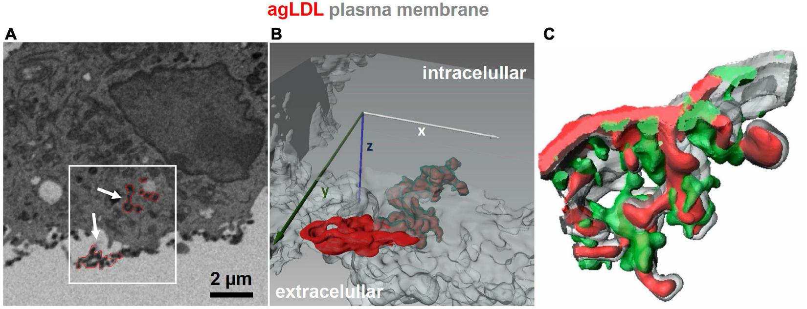 3D imaging of lysosomal synapses. (A,B) Focused ion beam-scanning electron microscopy (FIB-SEM) images were acquired from J774 cells incubated with colloidal-gold-labeled aggregated LDL (agLDL) for 1 h. A stack of 100 FIB-SEM images with 40 nm separating each image was obtained, and agLDL was observed within the lysosomal synapse that was connected with the extracellular space. Panel (A) shows a single scanning EM image of a macrophage interacting with agLDL. Regions of agLDL labeled with colloidal gold are outlined in red. A 3D representation of the region highlighted by the box in panel (A) was generated using image processing software to display agLDL and the cellular plasma membrane forming the compartment. Panel (B) shows both extracellular agLDL and the portion contained in deep membrane invaginations. Plasma membrane in the invagination (labeled green) tightly surrounds the agLDL contained within the lysosomal synapse. (C) Mouse bone marrow derived macrophages were incubated with Alexa546-agLDL for 1 h, fixed and stained with Alexa488-phalloidin to visualize F-actin. A 3D reconstruction from a confocal microscopy stack shows features such as rings and “fingers” of F-actin (green) surrounding the aggregate (red). The plasma membrane is labeled in gray [adapted from Singh et al. (43)].