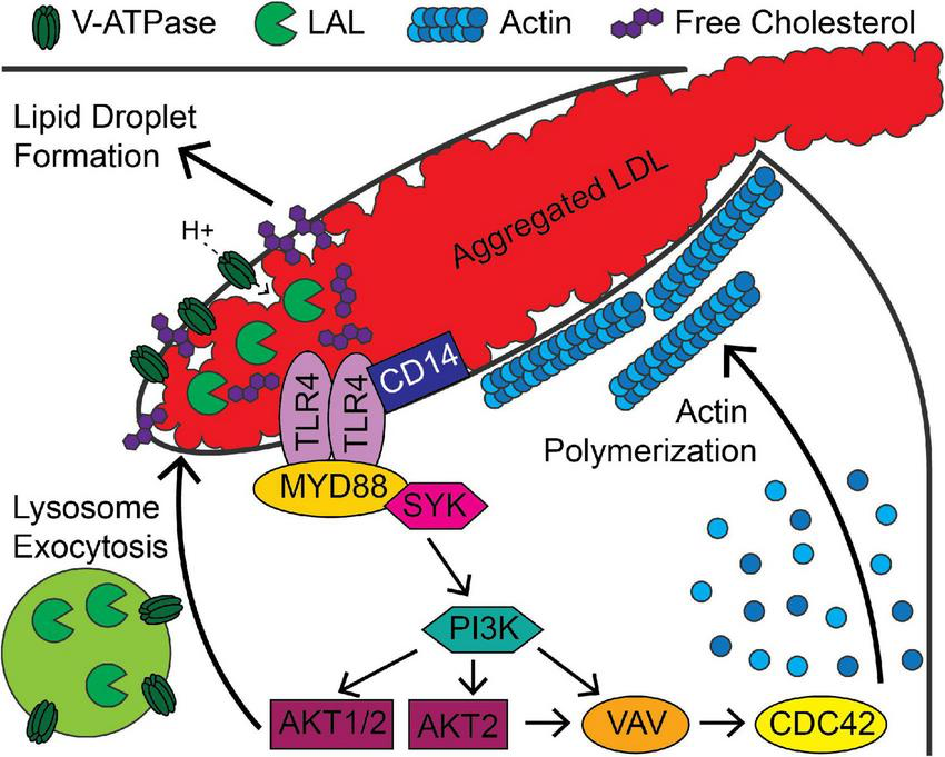 Signaling pathways associated with digestive exophagy of aggregated LDL. Aggregated LDL-induced TLR4/CD14 signaling activates MYD88, PI3K and AKT and leads to formation of the lysosomal synapse. Activation of signaling through AKT1 and AKT2 stimulates lysosome exocytosis, which delivers lysosomal acid lipase (LAL) to the compartment. Vacuolar ATPase (V-ATPase), present on the plasma membrane and the lysosomal membranes, lowers the pH of the compartment. This activates LAL in the compartment, which stimulates agLDL degradation and generation of free cholesterol. This cholesterol inserts into the plasma membrane and further stimulates signaling. The cholesterol is re-esterified in the cell, leading to formation of lipid droplets. The activity of PI3K and AKT2 lead to VAV and CDC42 activation that support longer term stabilization of the compartment by promoting actin polymerization.