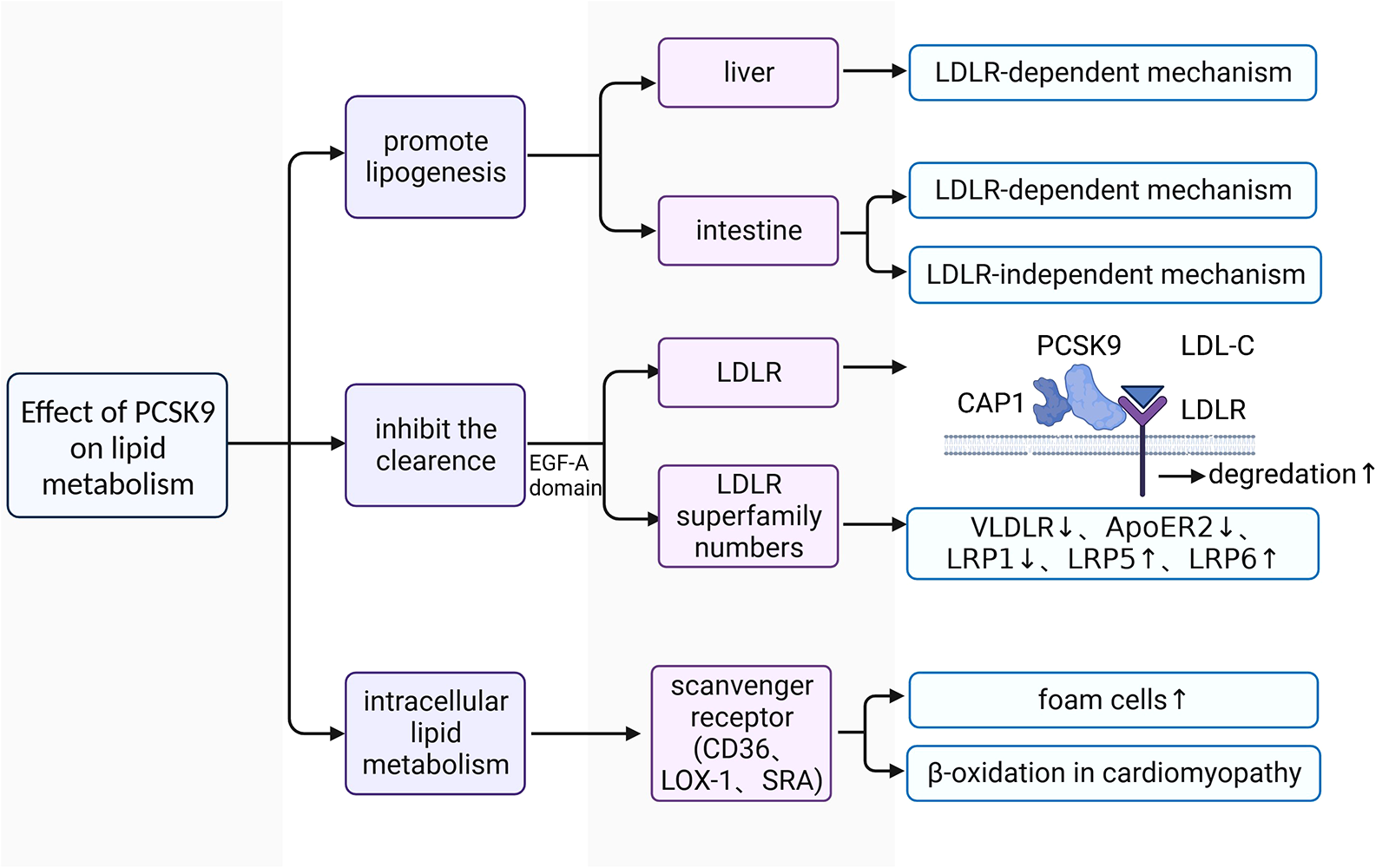 The functional mechanism of PCSK9 in regulating lipid metabolism. LDL-C, low-density lipoprotein-cholesterol; LDLR, low-density lipoprotein receptor; VLDLR, very low-density lipoprotein receptor; ApoER2, apolipoprotein E receptor 2; PCSK9, proprotein convertase subtilisin/kexin type 9; CAP1, cyclase associated protein 1; LOX1, lectin-like oxidized low-density lipoprotein receptor 1; SRA, scavenger receptor type A; EGF-A, epidermal growth factor precursor homology domain A; LRP1, LDLR-related protein 1; LRP5, LDLR-related protein 5; LRP6, LDLR-related protein 6.