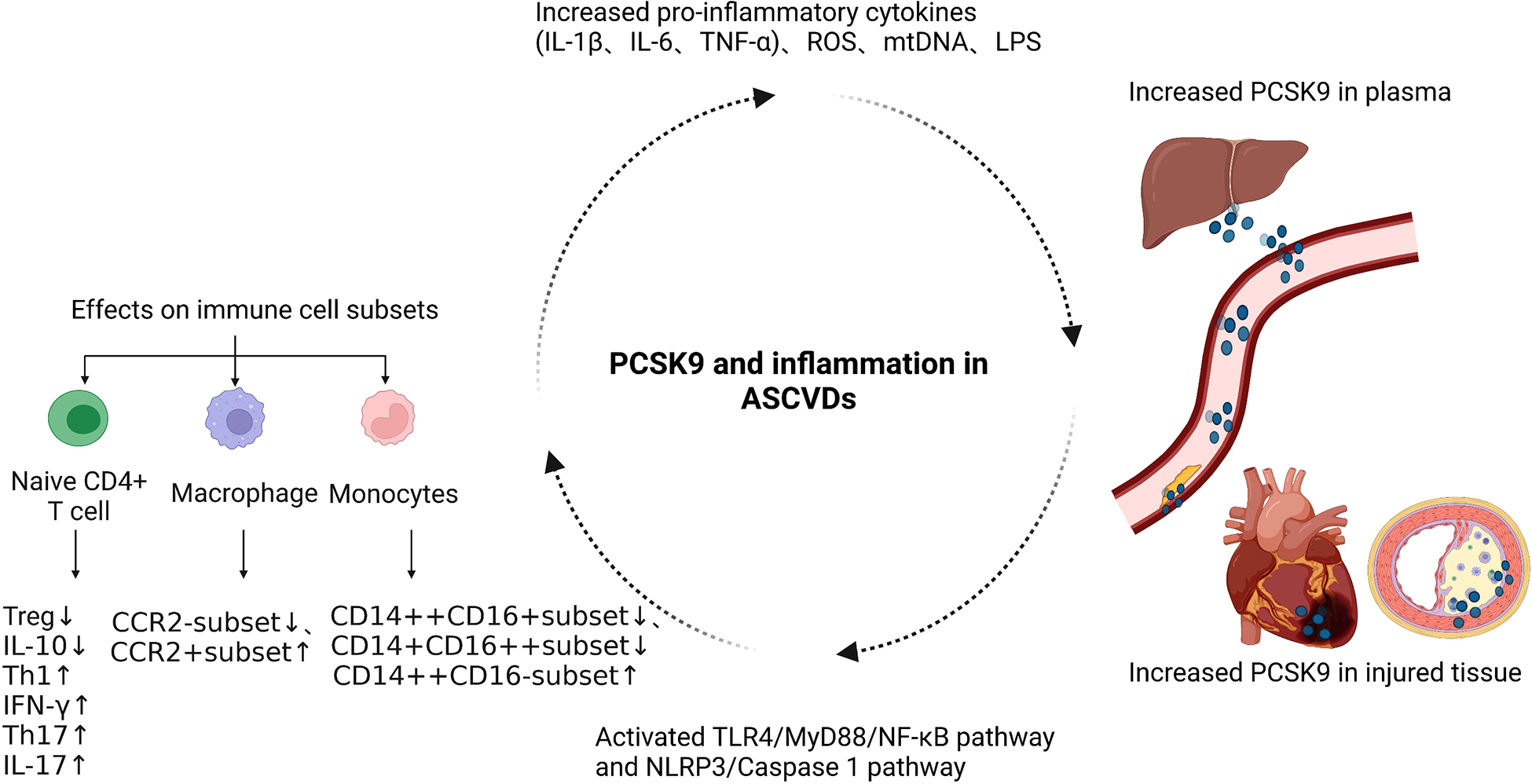 In addition to regulating inflammatory cytokines, numerous studies have linked PCSK9 with immune cell subsets in ASCVDs. Circulating monocytes are usually divided into three categories, including classical monocytes (CD14++CD16−; CMs), intermediate monocytes (CD14++CD16+; IMs) and nonclassical monocytes (CD14+CD16++; NCMs), among which CMs have strong proinflammatory functions (99, 100). When stable coronary artery disease occurs, the proportion of CMs to total monocytes is larger in patients with higher PCSK9 levels. Increased PCSK9 promotes the polarization of monocytes from IM and NCM-like phenotypes to a CM-like phenotype (101). In patients with hyperlipidemia, PCSK9 induces the expression of C-C chemokine receptor type 2 (CCR2) on the surface of monocytes and enhances their migration ability (102).