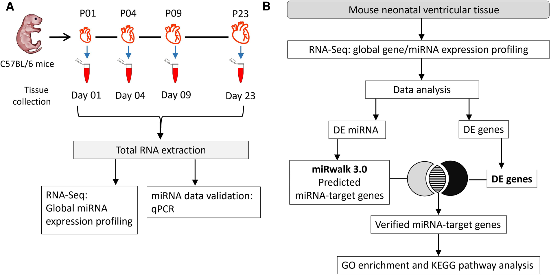 Experimental workflow. (A) Total RNA was collected on postnatal days 1, 4, 9, and 23 (P01, P04, P09 and P23, respectively) from mouse ventricles. RNA samples from 4 hearts/group were used in global miRNA expression profiling and data validation studies using qPCR. (B) Flow chart of data analysis and integration of miRNA sequencing data with transcriptomic data from (23) to identify target genes. Putative gene targets of miRNAs were verified from differentially regulated genes identified in our previous transcriptomic data analysis (23). DE, differentially expressed; FC, fold change.