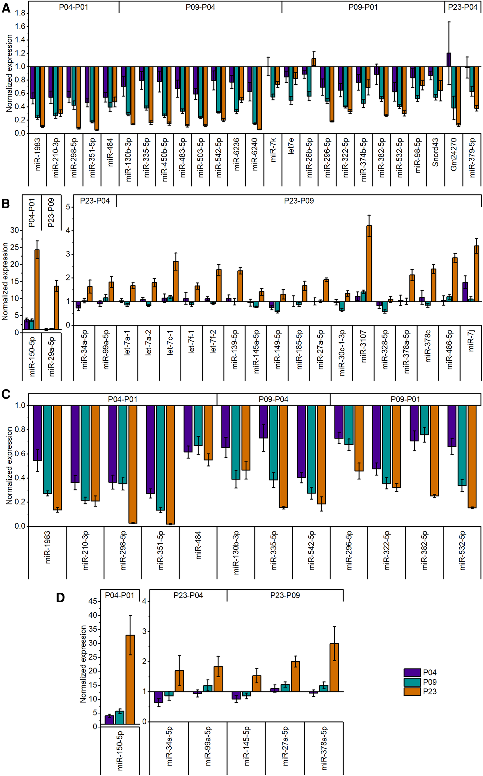 We also compared the time point P09 (neonatal heart with no regenerative capacity) to P01 (neonatal heart with full regenerative capacity) and identified 24 differentially expressed miRNAs (Supplementary File S1). Nine of these were miRNAs that had not been differentially expressed in previous comparisons, and 4 showed consistent downregulation also in the P23–P01 comparison (Figure 2). The remaining 5 miRNAs showed lowest expression levels at P09 but thereafter their expression increased so that their expression level at P23 was close to that at P01 (miR-374b, let-7e, miR-98, Snord43, and miR-26b-5p) or significantly upregulated when compared to P01 (miR-26b-5p). List of differentially expressed miRNAs from all time-point comparisons is provided in the Supplementary File S1.