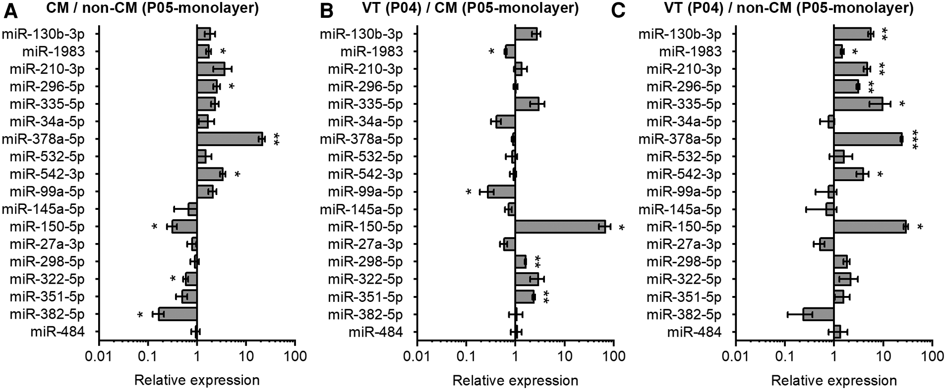 In addition to CMs, the VT samples used for the miRNA analysis also contain non-CMs. We therefore investigated the relative expression of selected miRNAs in CMs and non-CMs. Data in Figure 4A demonstrates higher expression of miR-378a-5p, miR-542-5p, and miR-296-5p, and lower expression miR-382-5p and miR-150-5p in CMs compared to non-CMs. We further compared the miRNA expression levels in VT samples to in vitro monolayer cultures of CMs and non-CMs. miR-351-5p and miR-150-5p showed significantly higher expression in VT samples compared to CM monolayer culture, while miR-99a-5p showed lower expression in VT than in cultured CMs (Figure 4B). On the other hand, the expression of miR-150-5p, miR-378a-5p, miR-335-5p, miR-130b-3p, miR-210-3p, miR-542-5p, and miR-296-5p was higher in VT samples than in non-CM monolayer culture (Figure 4C). The discrepancies between the CM/non-CM and tissue vs. in vitro comparisons can be attributed to effects of cell isolation and in vitro conditions to miRNA expression as well as differences in survival or proliferation rates of specific cell types during cell isolation and the 4-day in vitro monolayer culture.
